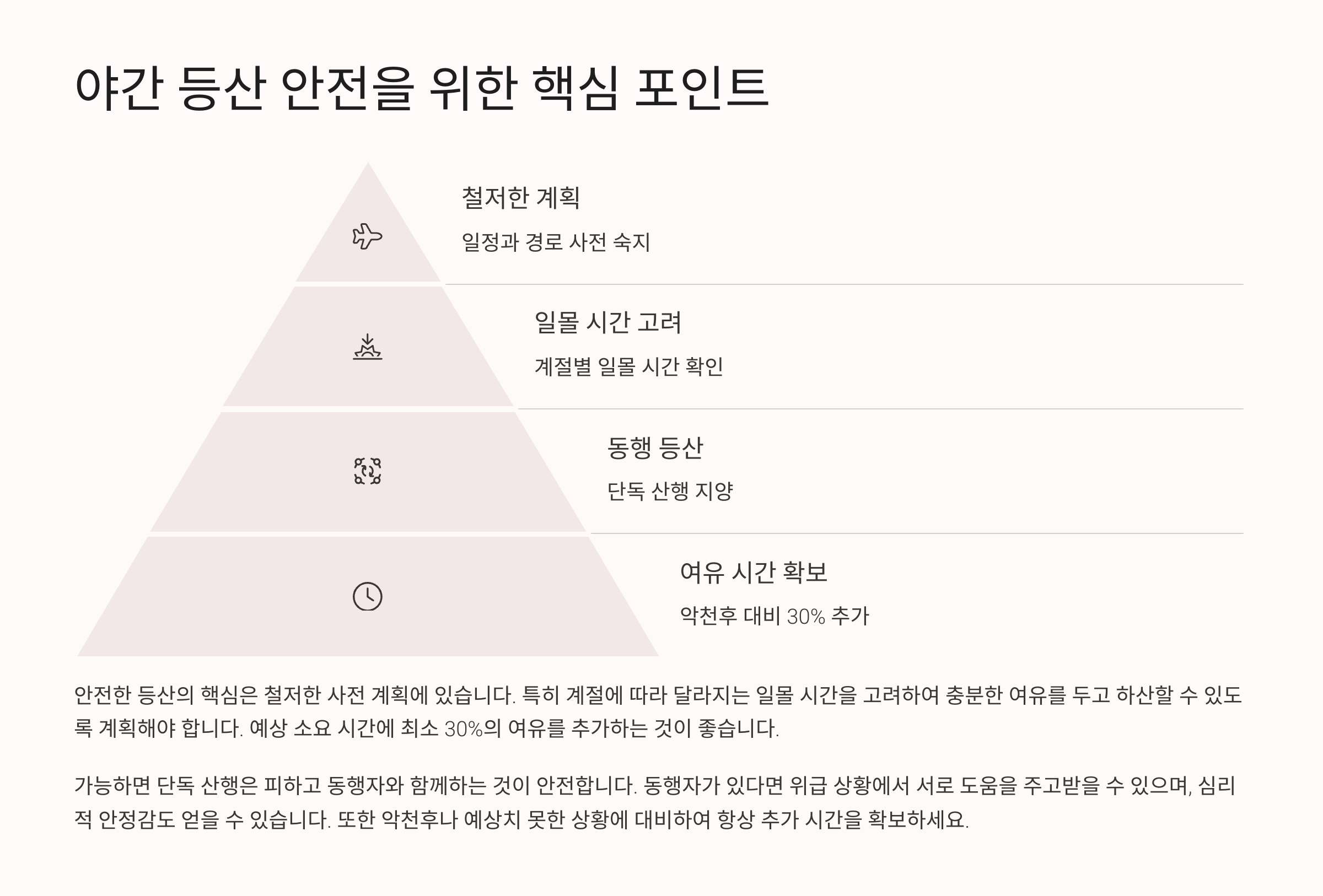 | 일몰 30분 이후 | 사방 어두움, 길 식별 어려움 | 하산 중지, 구조요청 검토 |