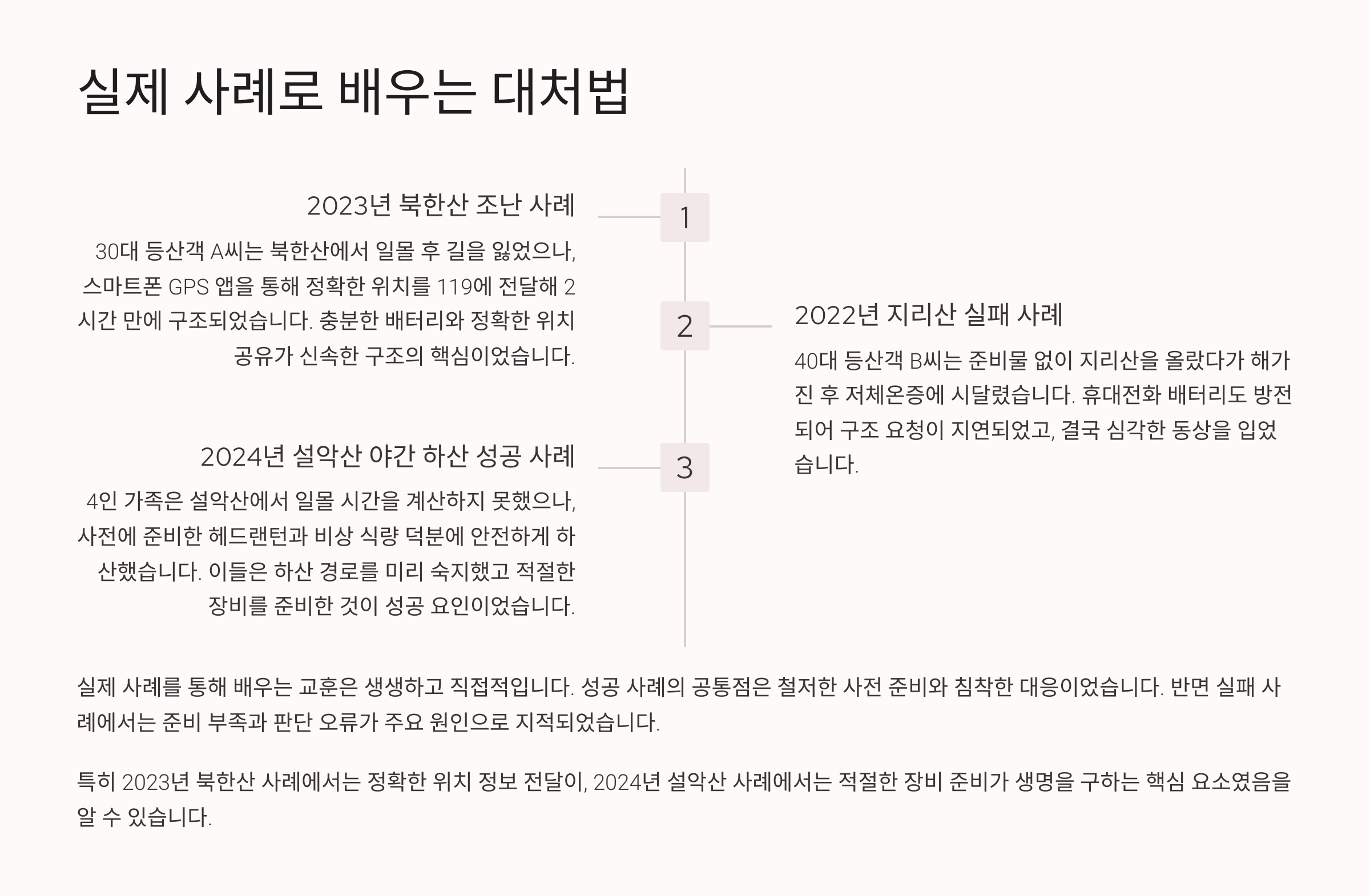또 다른 사례는 강원도 설악산에서 발생했어요. 30대 여성이 해 지기 전 정상에 도달하려다 하산 시간이 늦어졌고, 결국 밤이 돼 길을 잃었어요. 다행히 그녀는 일행과 떨어지지 않고, 구조 요청을 한 뒤 조용히 대기해서 무사히 구조되었답니다.