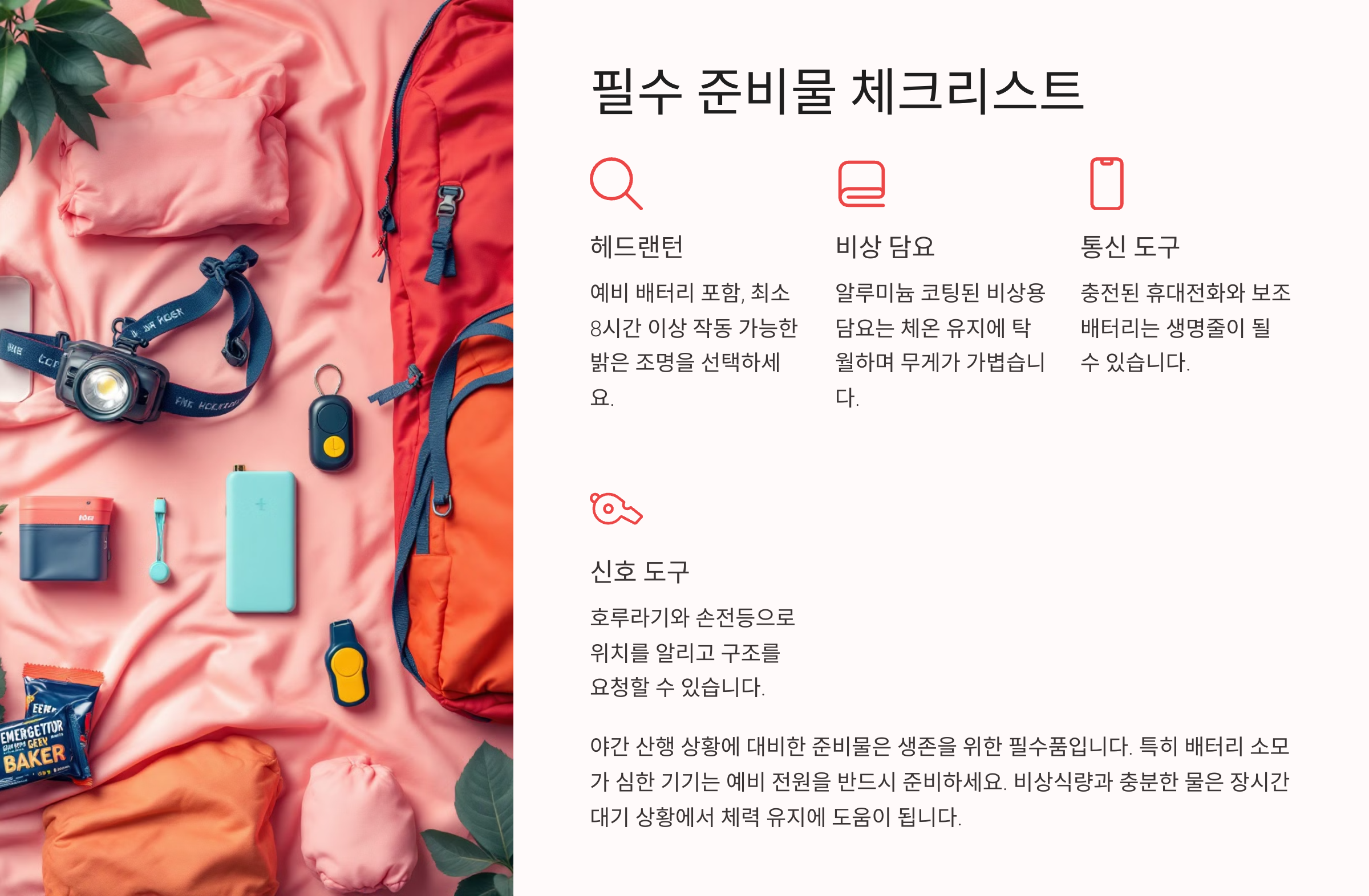 가볍고 실용적인 장비만 잘 챙겨도 위급 상황을 현명하게 대처할 수 있어요. 무게보다 ‘기능’을 기준으로 준비물을 선택하는 게 핵심이에요.