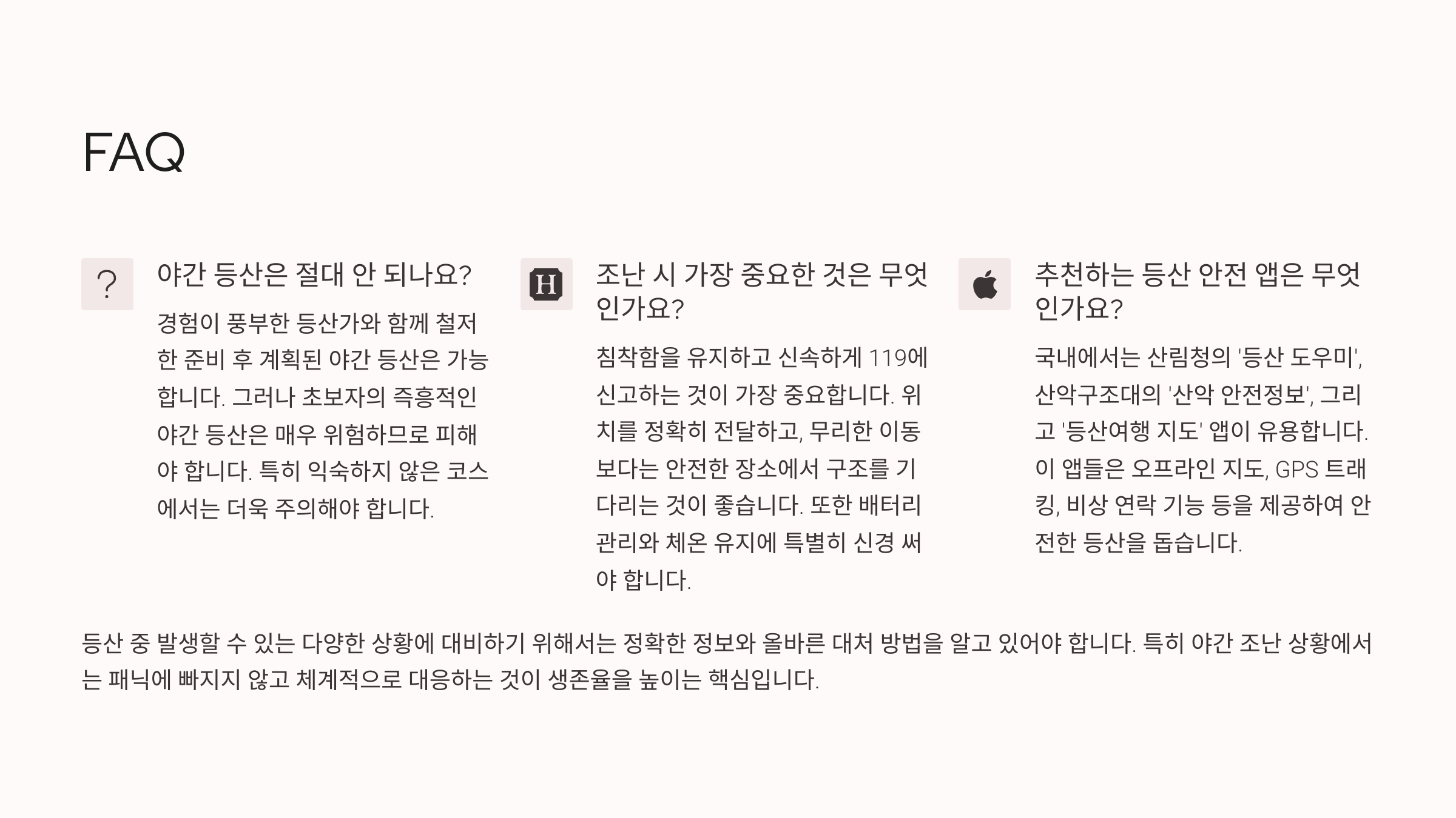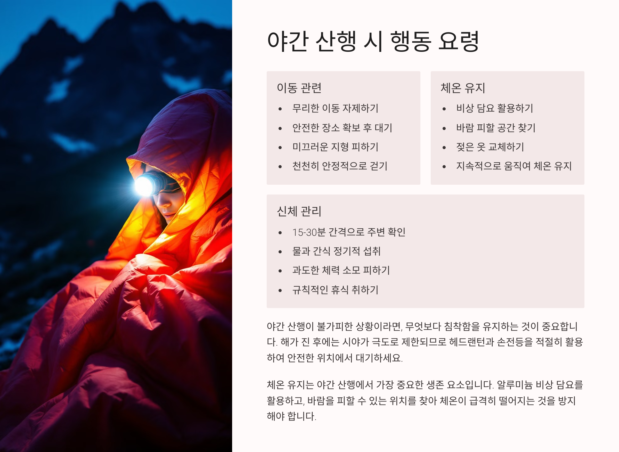 세 번째는 **무리하게 하산하지 않는 것**이에요. 너무 어두워서 길이 안 보이면, 주변의 안전한 곳을 찾아 **야영에 가까운 대기**를 선택하는 게 좋아요. 구조 요청 후 구조대를 기다리는 게 훨씬 안전하답니다.