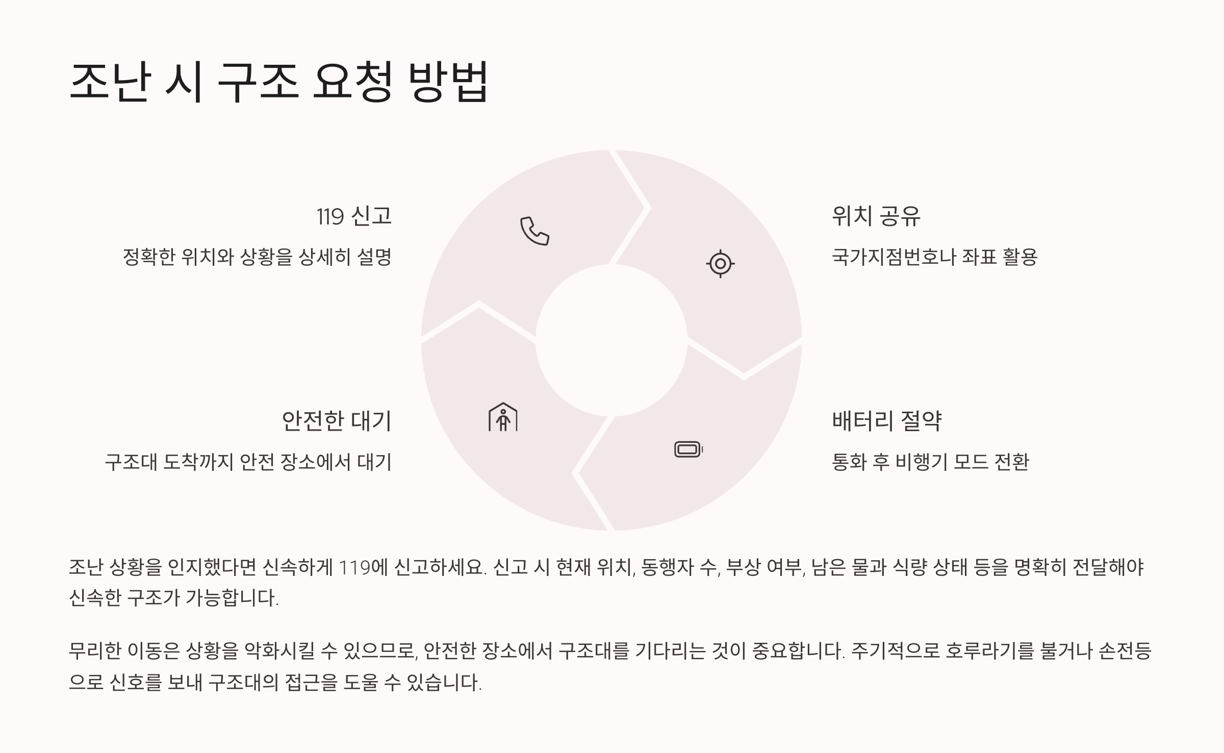 혹시 배터리가 없거나 통신이 안 된다면 **호루라기 소리**를 일정한 간격으로 내거나, 손전등을 3회 깜빡이는 등 **조난 신호**를 활용해야 해요. 밤에는 조명과 소리가 구조대에게 가장 효과적인 신호가 돼요.