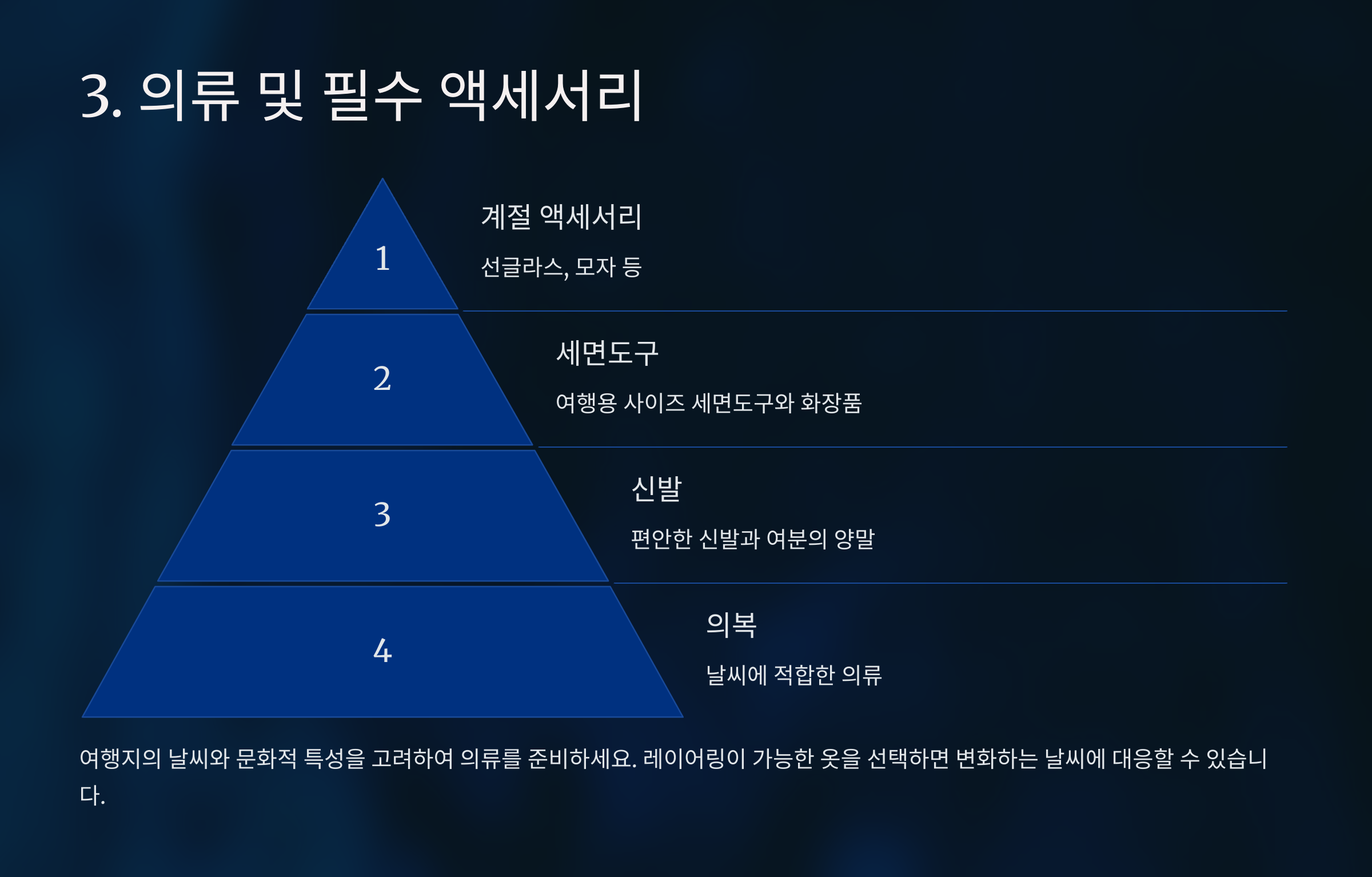 여행지의 날씨와 기온에 맞춰 옷을 챙기는 게 중요해요! 특히, 기온 차가 심한 지역에서는 여러 겹 입을 수 있는 옷을 준비하면 좋아요.