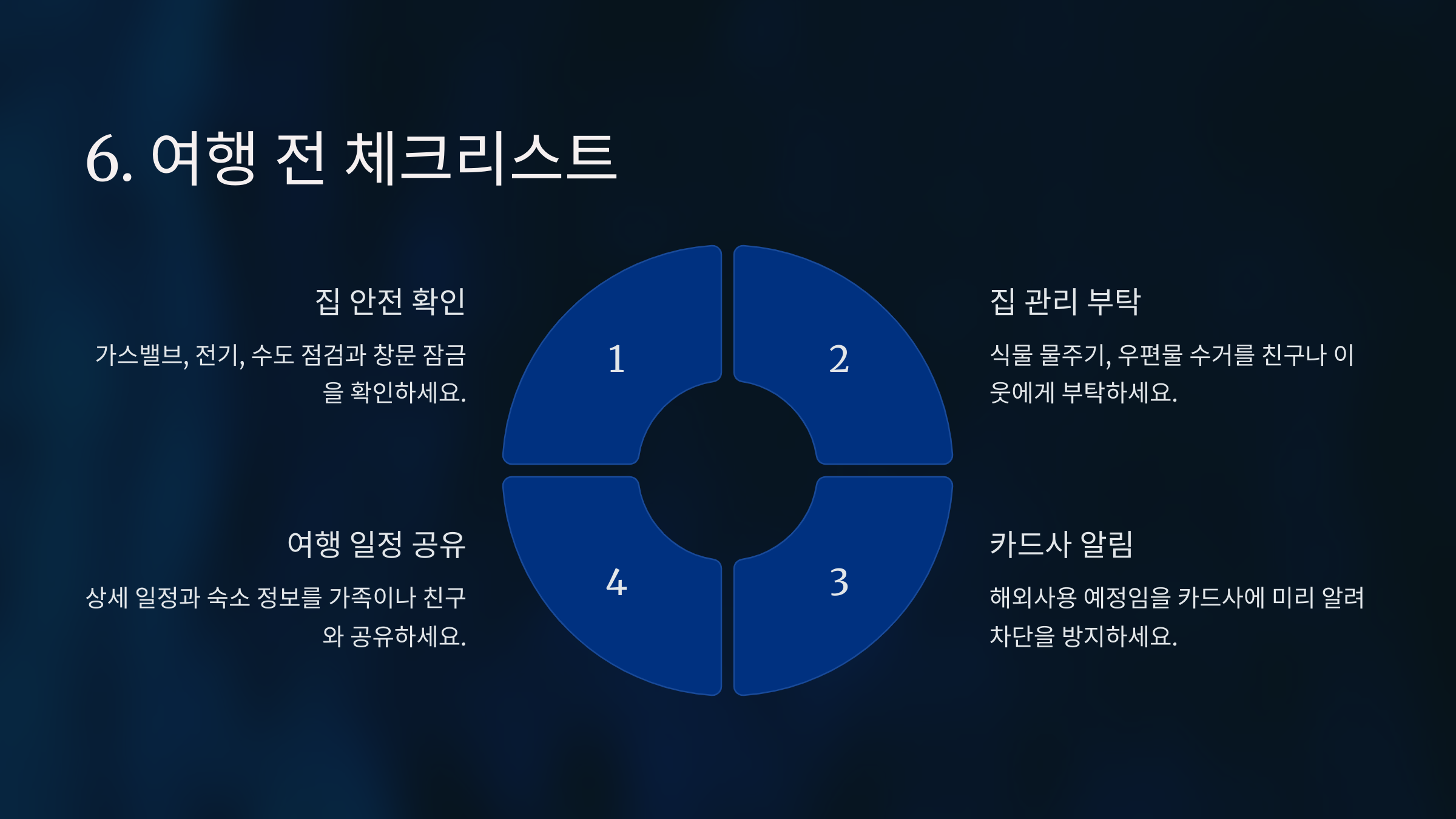 ✔ 비자: 여행 국가의 입국 규정을 확인하고, 비자가 필요한 경우 미리 준비하세요.