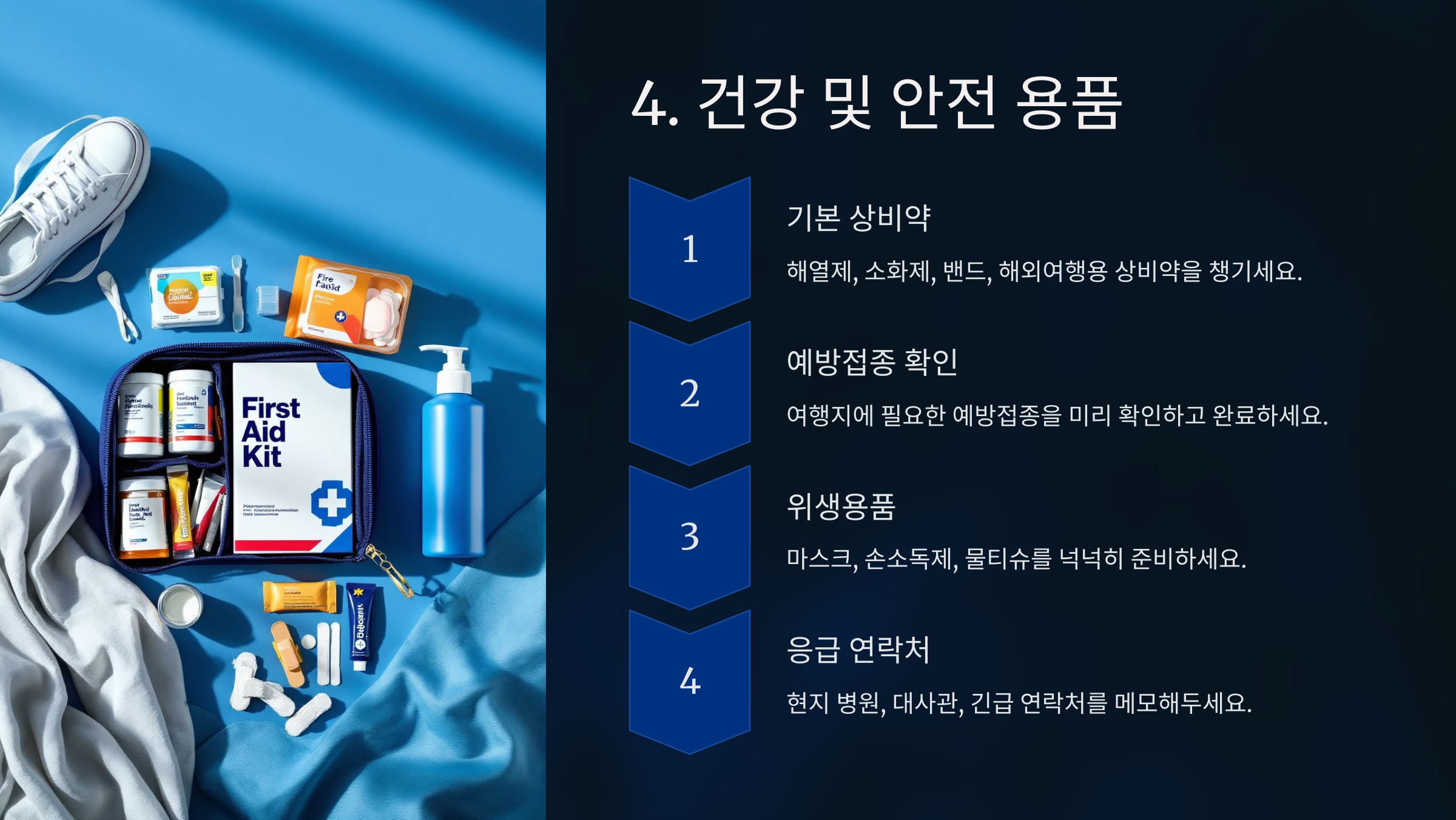 ✔ 상비약: 감기약, 소화제, 진통제, 지사제 등을 챙겨 가세요. 특히 해외 여행에서는 낯선 음식이 몸에 맞지 않을 수도 있어요.