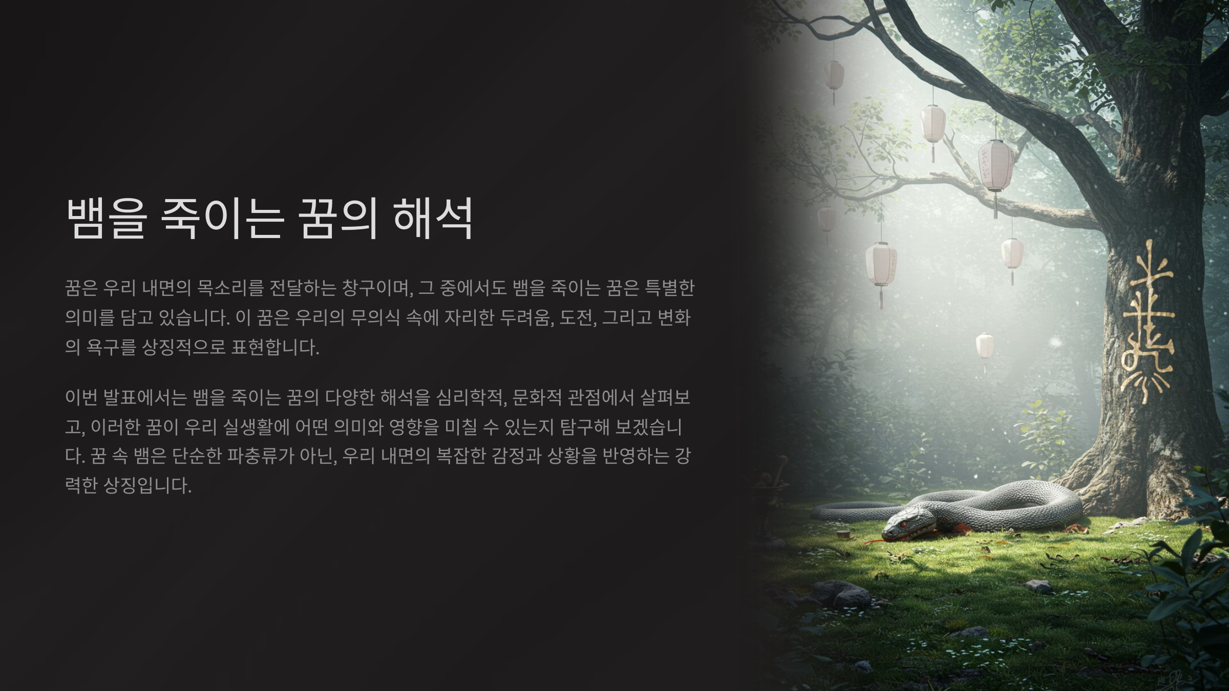 꿈에서 뱀을 죽이는 경험은 많은 사람들이 강렬하게 기억하는 꿈 중 하나예요. 이런 꿈을 꾸고 나면 대부분 복잡한 감정을 느끼게 되는데, 두려움, 안도감, 죄책감 등이 뒤섞여 나타나는 경우가 많아요. 뱀을 죽이는 행위는 단순해 보이지만, 그 안에는 꿈꾸는 사람의 깊은 심리 상태와 무의식적 욕구가 복합적으로 담겨 있답니다.