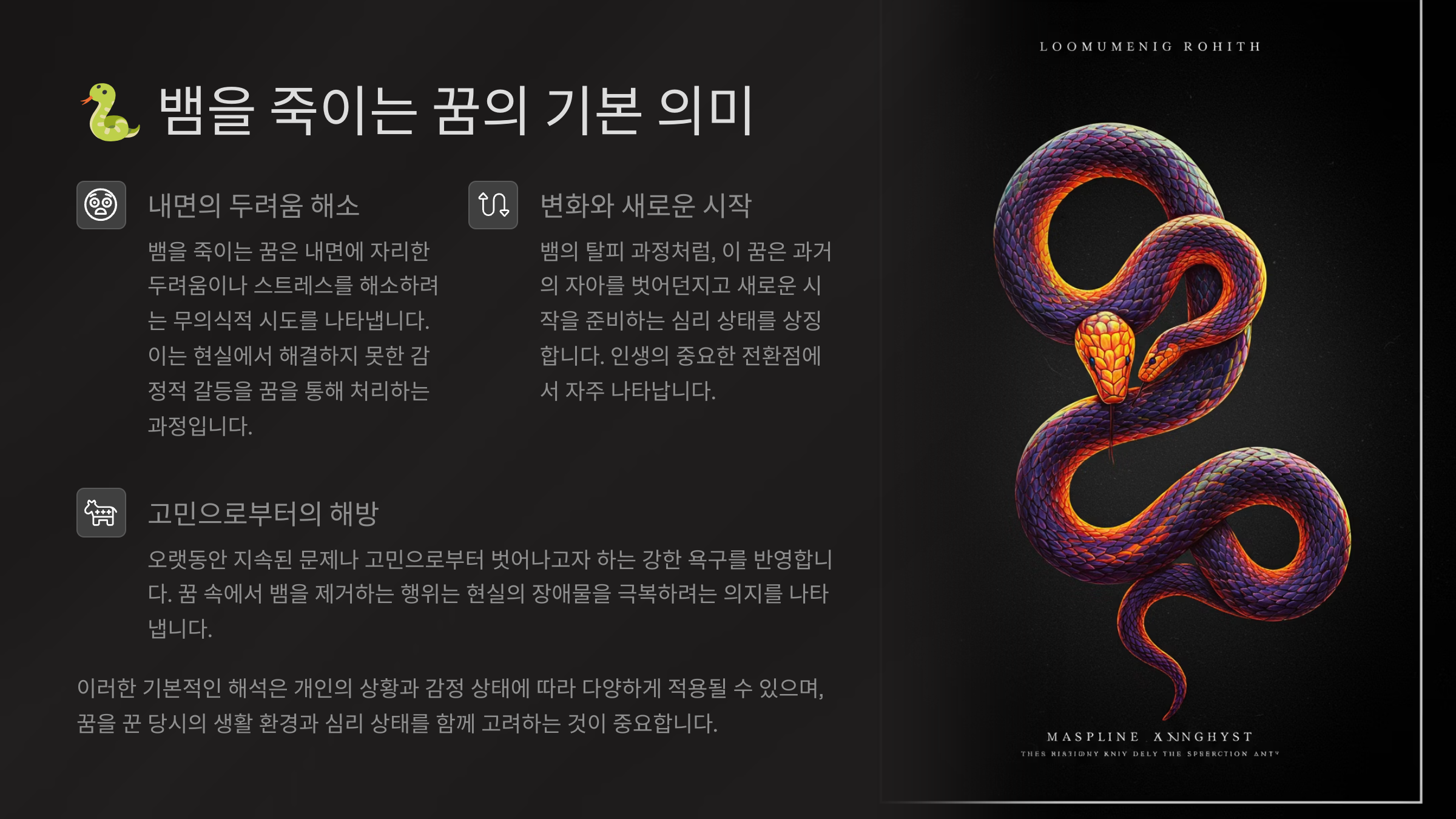 이런 꿈은 보통 인생의 중요한 전환점이나 갈등 상황에서 나타나는 경우가 많아요. 뱀이라는 상징적 존재를 제거한다는 것은 무언가를 극복하거나 해결하려는 강한 의지를 나타내기 때문이에요. 하지만 뱀을 죽인 후의 감정이나 상황에 따라 해석이 완전히 달라질 수 있어서, 꿈의 전체적인 맥락을 함께 살펴보는 것이 중요해요.