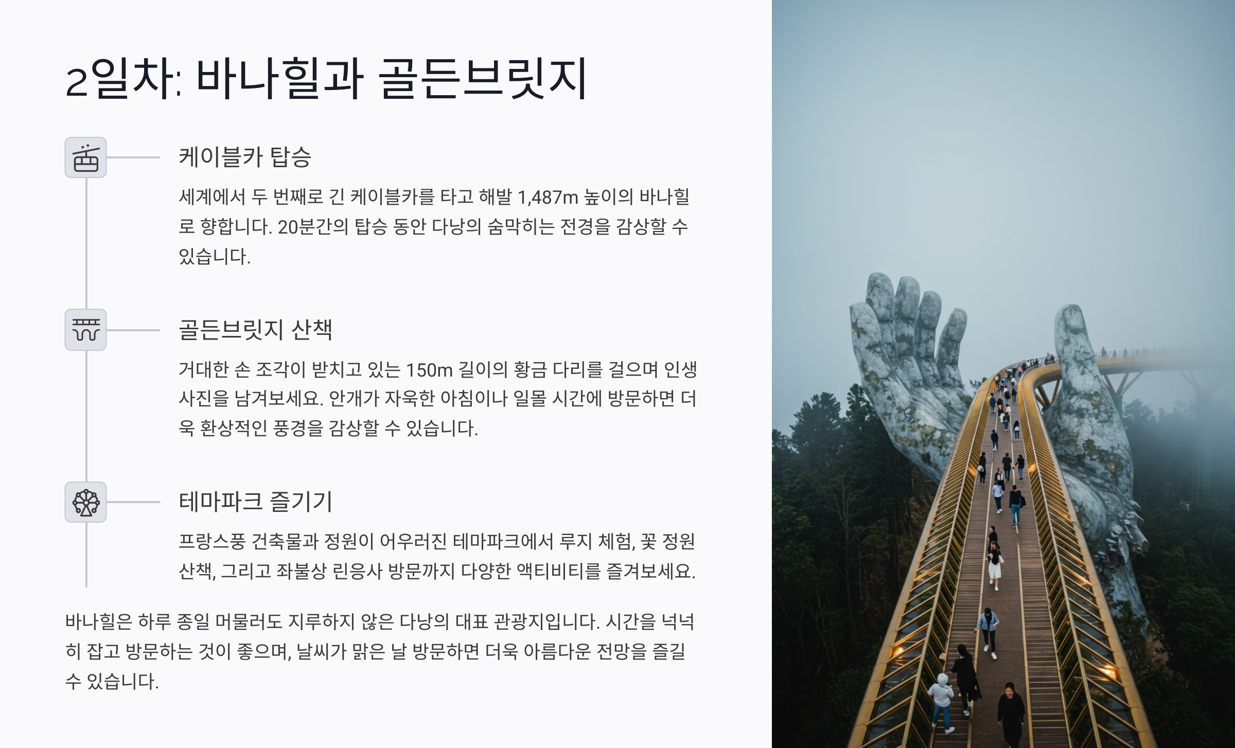 2일차 코스는 조금 빡빡하지만, 다낭 여행의 핵심을 제대로 담고 있어요. 바나힐은 정말 영화 속 한 장면처럼 낭만적인 장소니까, 꼭 여유롭게 즐기고 오세요 💖