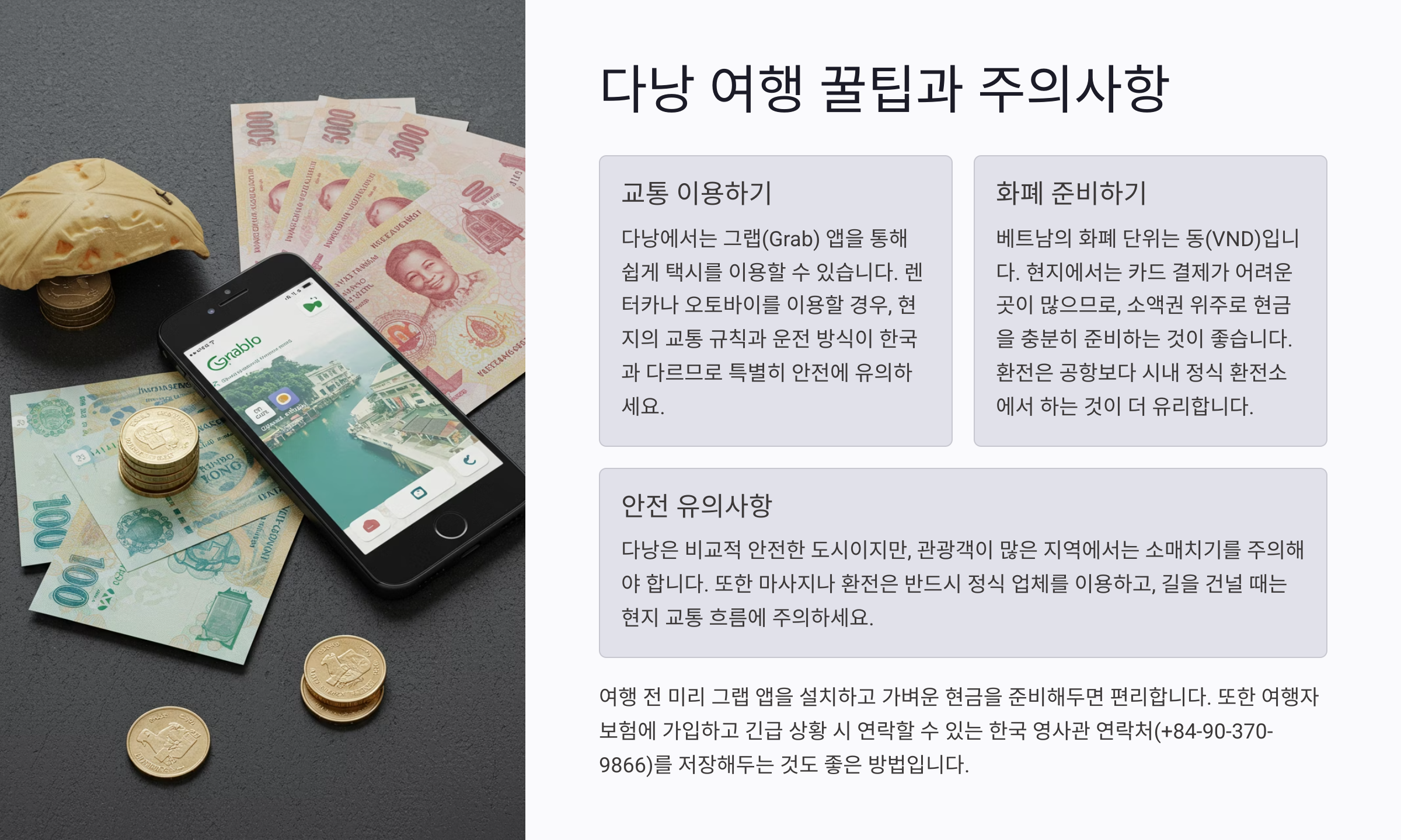 다낭 자유여행을 200% 즐기기 위해서는 몇 가지 팁과 주의사항을 알고 가는 게 좋아요. 여행 전 체크리스트부터 현지에서 조심해야 할 부분까지 꼼꼼히 정리해볼게요. 미리 알면 확실히 더 편하고 즐거운 여행이 될 수 있답니다!