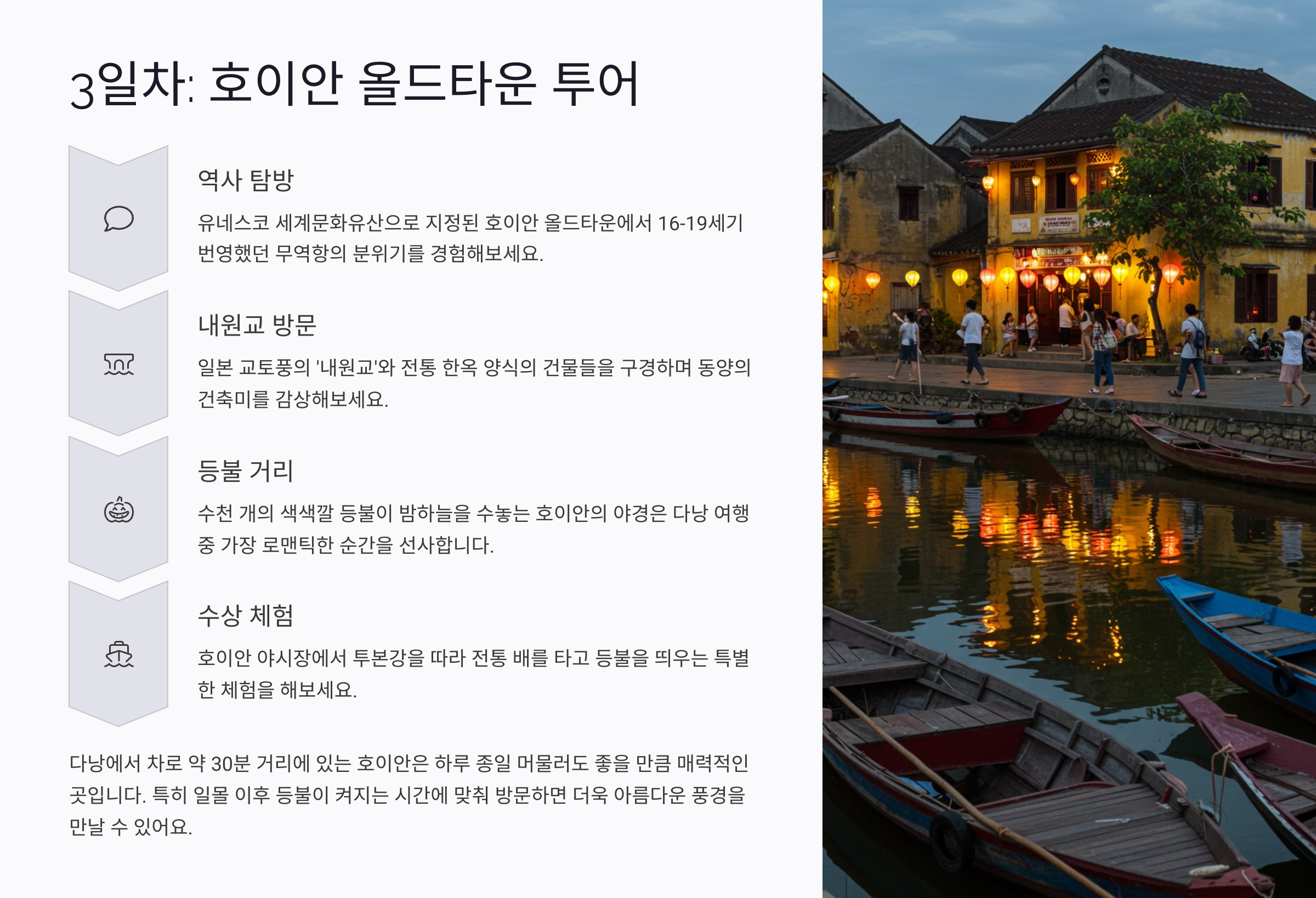 3일차에는 마음이 따뜻해지는 여행을 할 수 있어요. 소박하고 아름다운 호이안의 매력을 그대로 느끼며 여유로운 하루를 보내보세요.