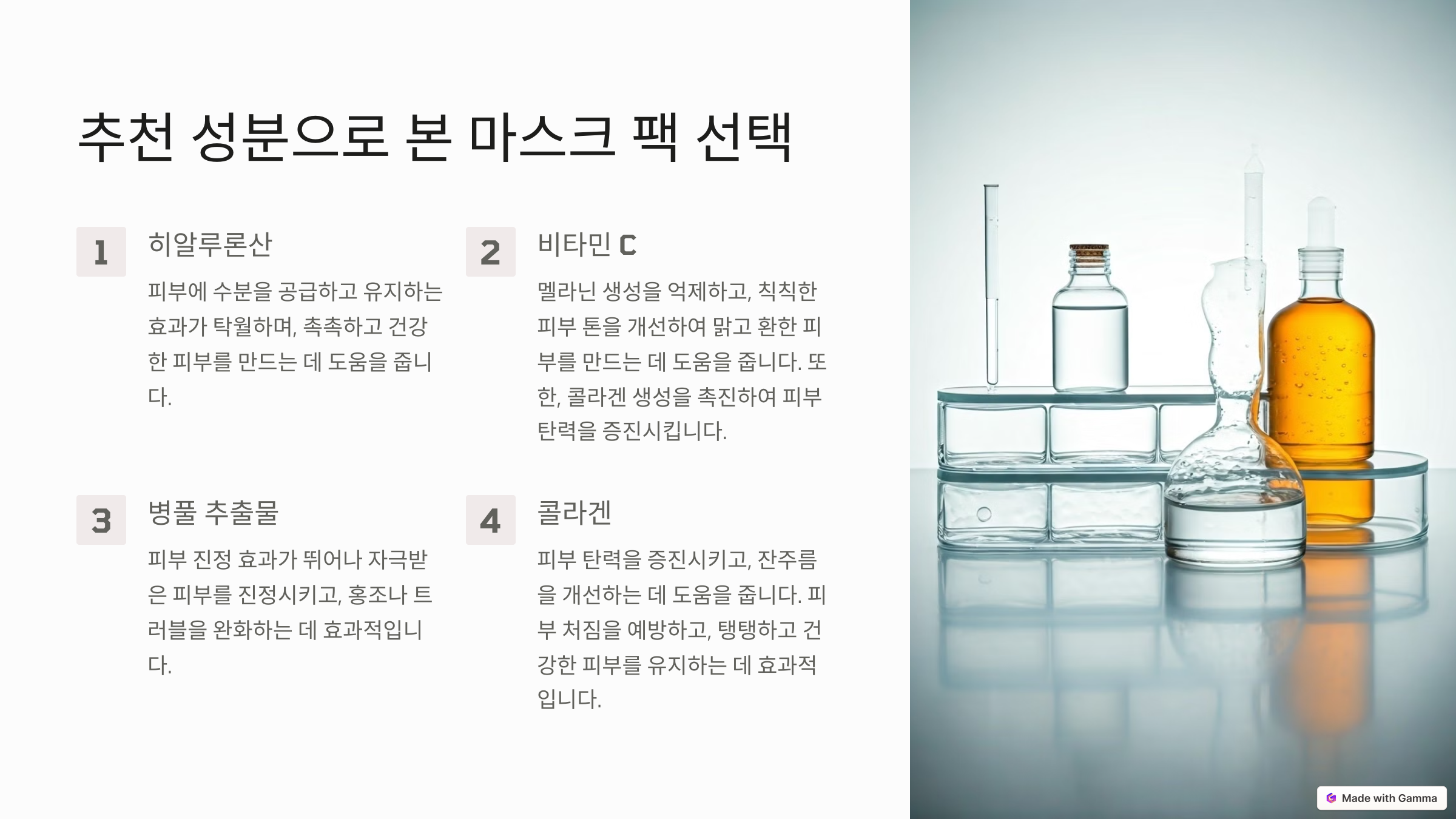 마스크 팩을 고를 때 성분표를 확인하는 것은 매우 중요해요. 성분이 제품의 효과를 좌우하기 때문이죠. 첫 번째로 추천하는 성분은 히알루론산이에요. 강력한 보습 효과로 피부 속까지 촉촉하게 만들어 주죠. 피부가 건조하다면 이 성분을 꼭 찾아보세요.