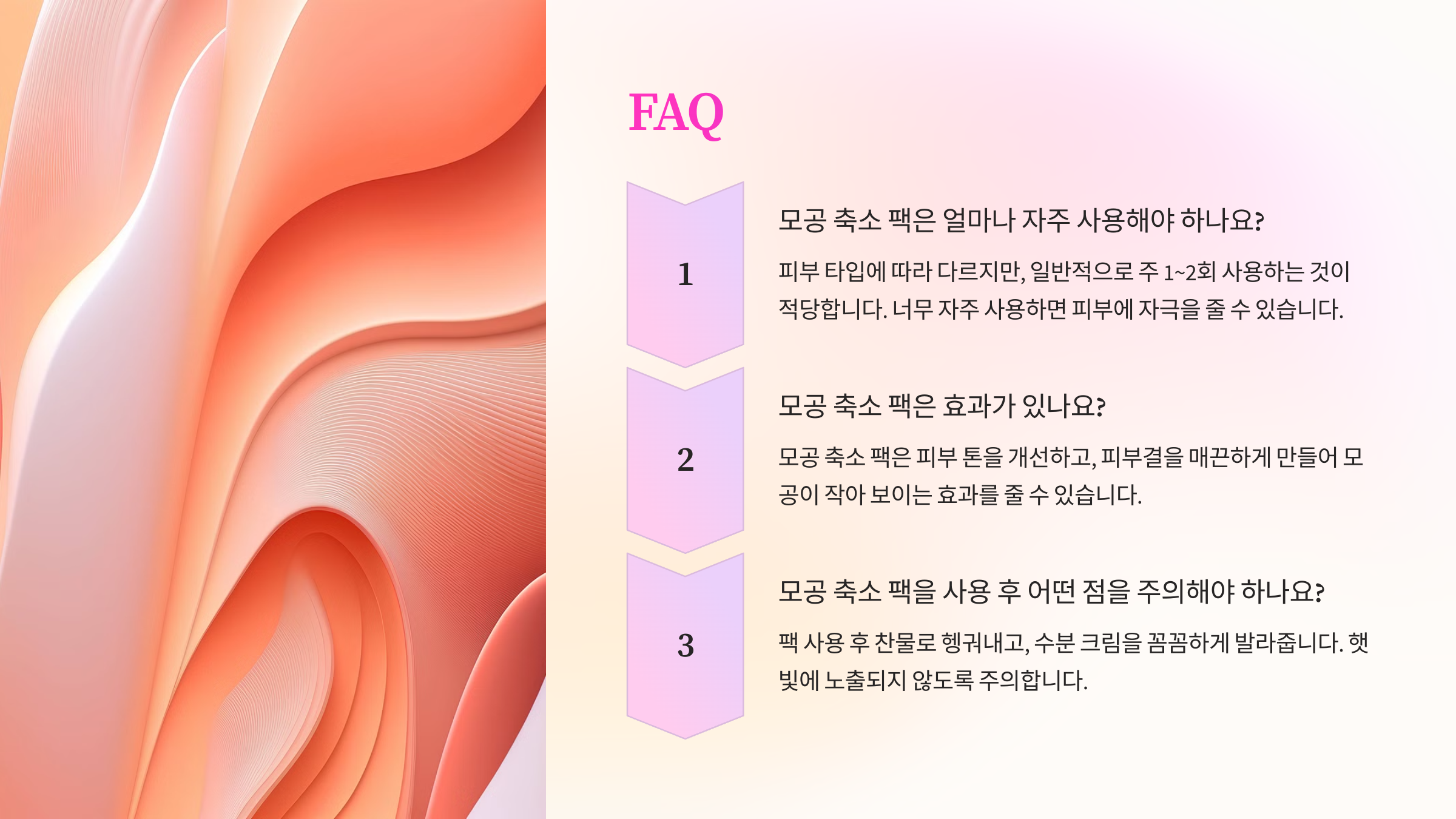 A3. 팩 사용 후 당김 현상이 있다면 즉시 수분 크림이나 진정제를 발라 피부를 진정시키세요. 다음에는 보습력이 높은 제품을 선택해보세요.