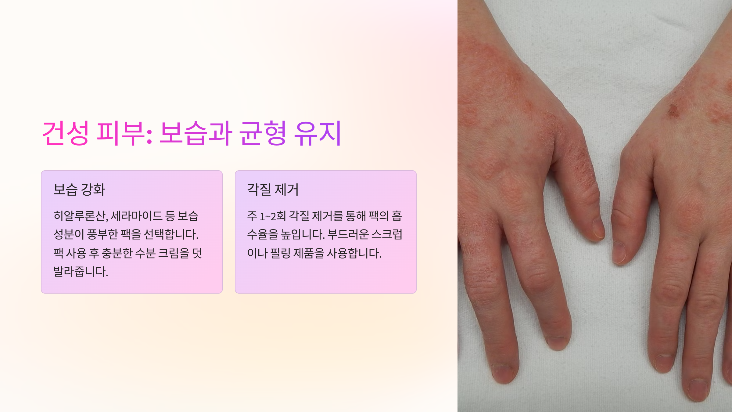 건성 피부는 팩의 사용 빈도도 조절이 필요해요. 너무 자주 사용하면 오히려 피부가 민감해질 수 있으니, 주 1~2회로 시작해보는 것이 좋아요. 피부 상태를 관찰하며 적절히 조정해보세요.