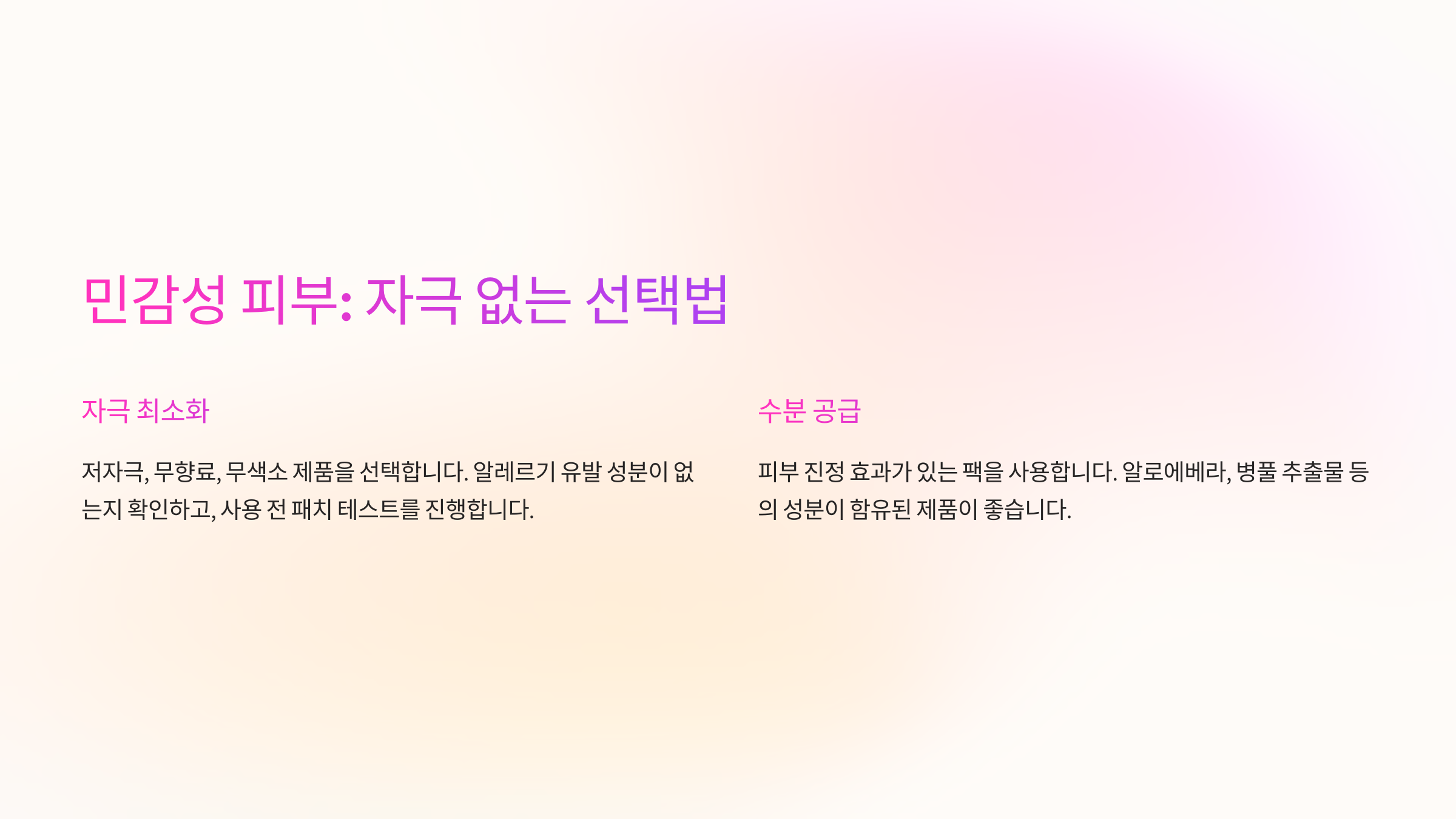 민감성 피부는 자극에 취약하기 때문에 성분 하나하나를 꼼꼼히 확인해야 해요. 알코올, 인공향료, 파라벤 등은 피하는 것이 좋아요. 반면, 지성 피부는 피지 조절에 초점을 맞춘 제품이 적합하고, 건성 피부는 보습이 포함된 팩이 필요하죠.