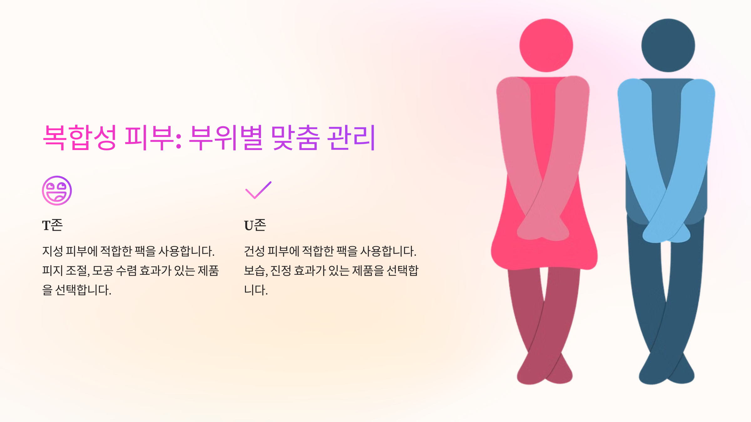 복합성 피부는 T존은 지성이고, U존은 건성인 경우가 많아서, 각 부위에 맞는 관리가 필요해요. 한 가지 팩으로 모든 부위를 관리하려다 보면 오히려 특정 부위에 부작용이 생길 수 있답니다.