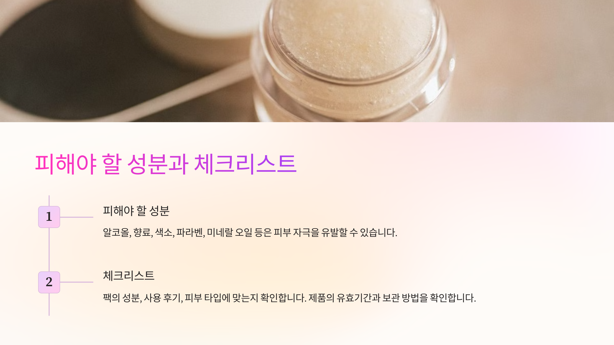 또한, 과도한 필링 성분이 포함된 팩도 주의가 필요해요. AHA, BHA 같은 성분은 적절히 사용하면 좋지만, 과도하게 사용하면 피부 장벽을 약화시키고 민감도를 높일 수 있답니다.