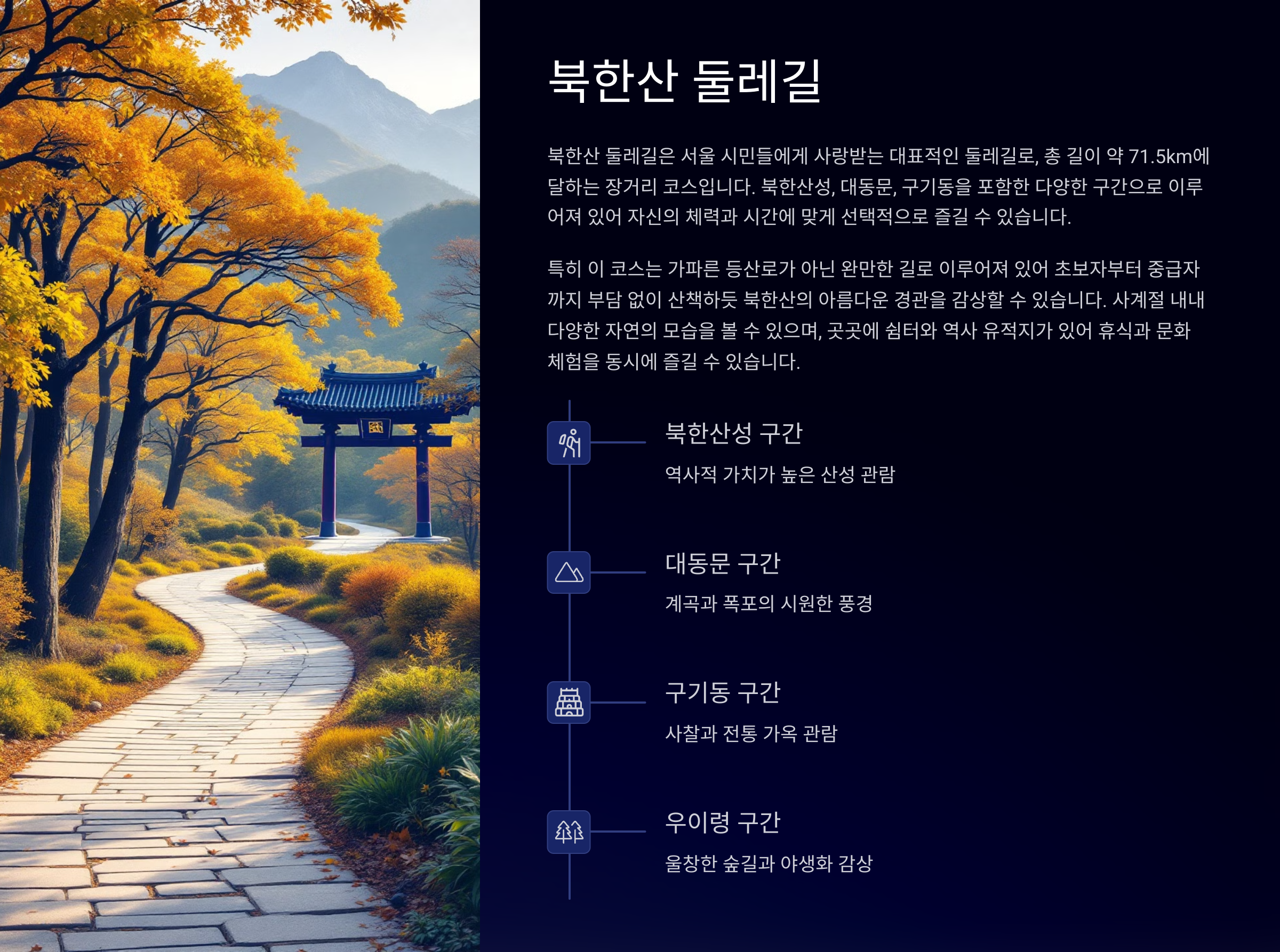 출입구는 구기동, 불광동, 우이동 등 다양하고, 지하철과 버스로도 쉽게 접근 가능해요. 북한산 둘레길은 ‘나 오늘 뭔가 한 것 같다’는 뿌듯함도 선물해주는 고마운 곳이랍니다 😊