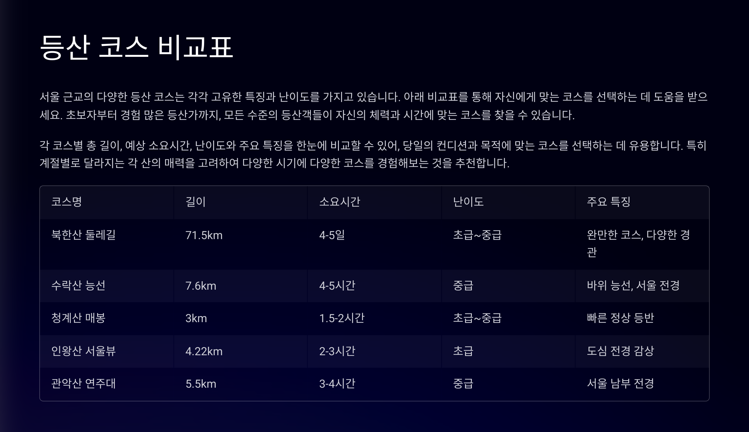 | 코스명 | 난이도 | 총 소요시간 | 접근성 | 특징 |
