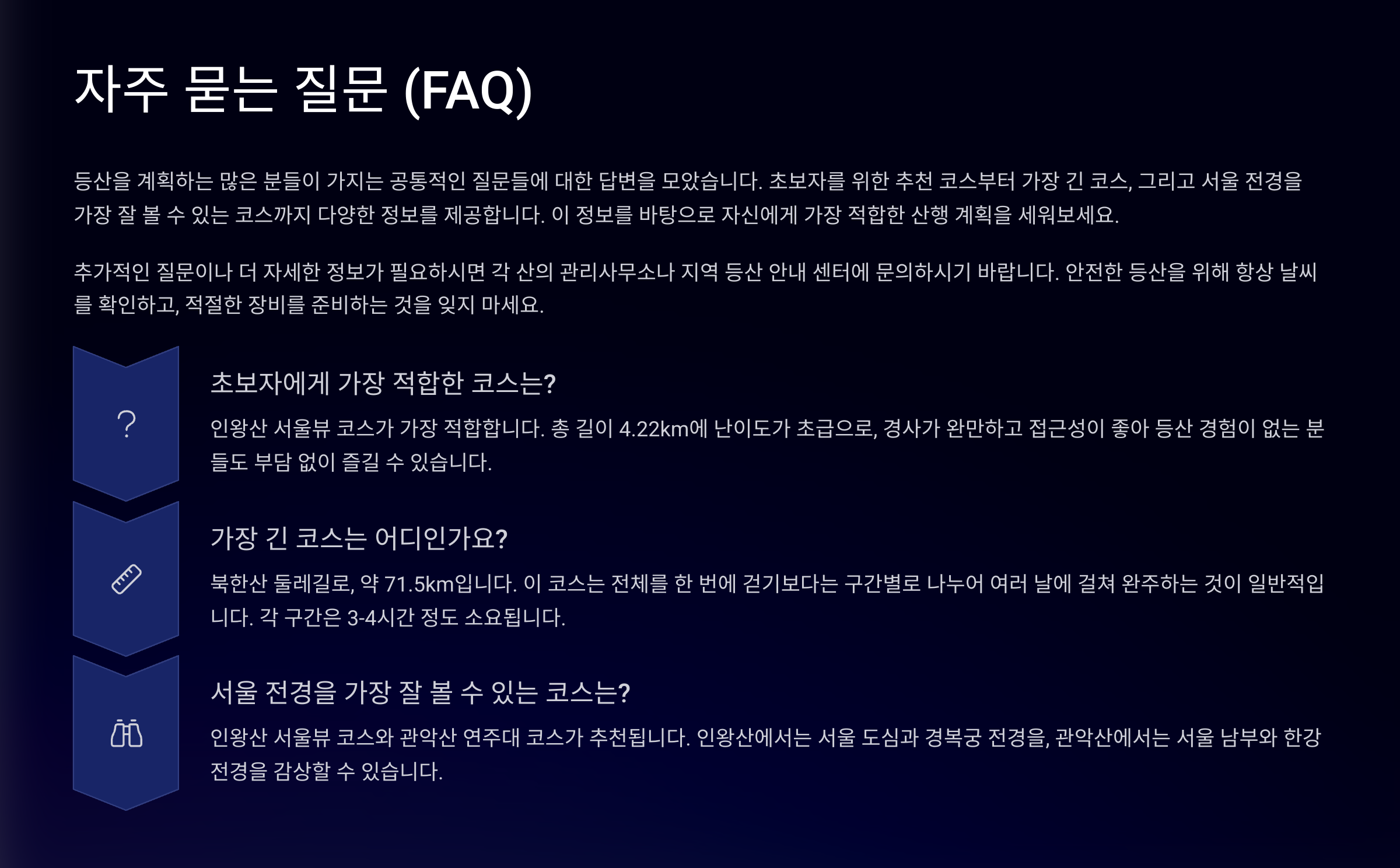 A3. 서울 근교 인기 코스는 등산객이 많아서 혼자 가도 비교적 안전하지만, 하산 시간은 해 지기 전으로 꼭 계획하세요. 휴대폰 배터리도 꼭 확인하고요!