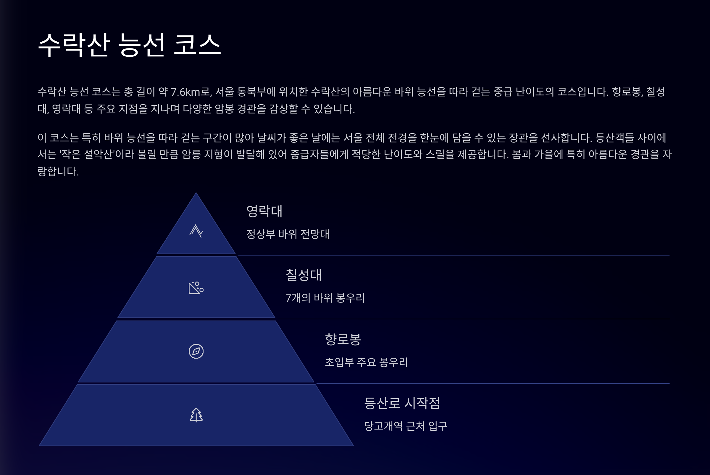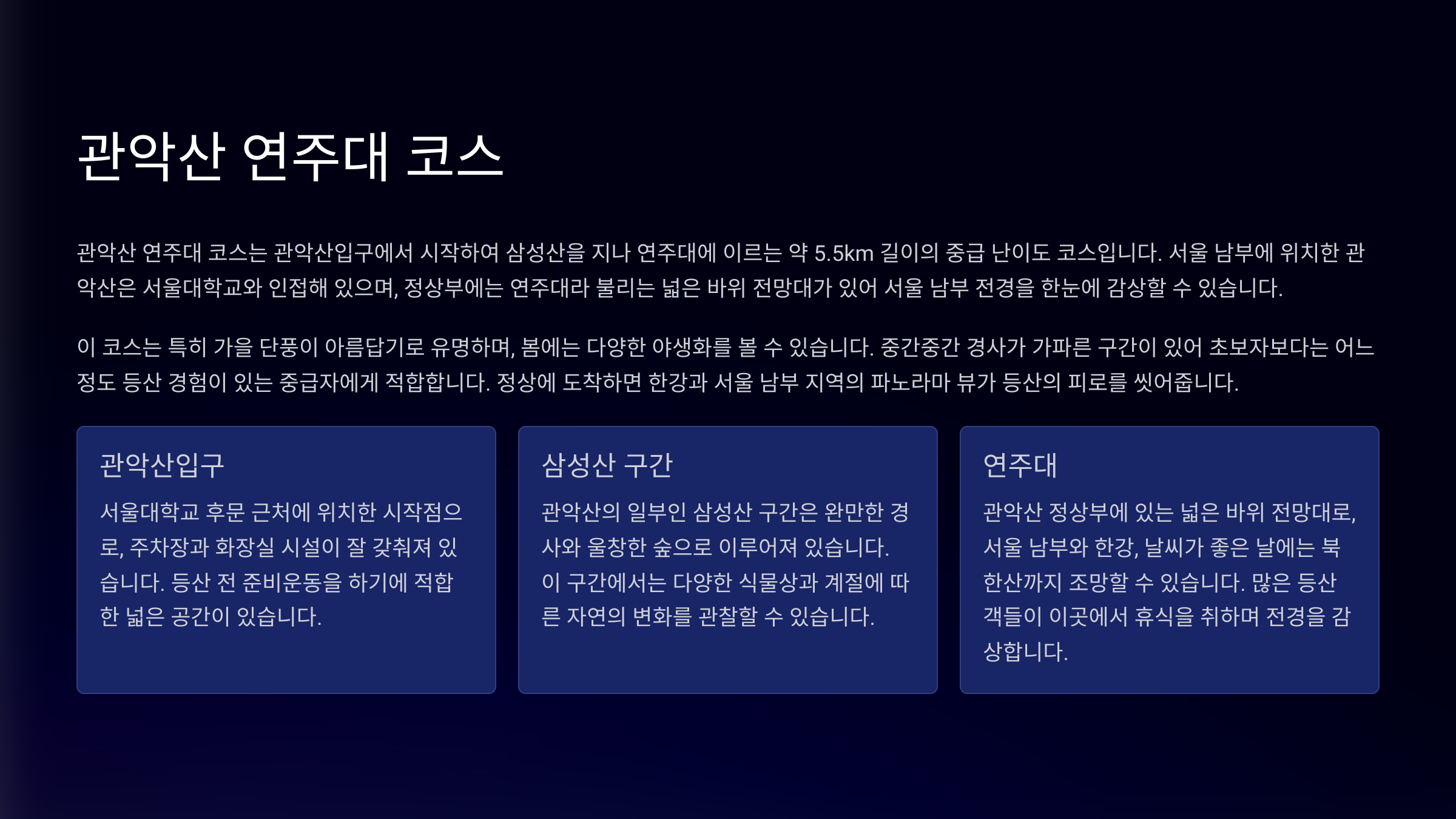 | 관악산 연주대 | ★★★☆☆ | 2시간 30분 | 우수 | 암릉, 조망, 도전적 |