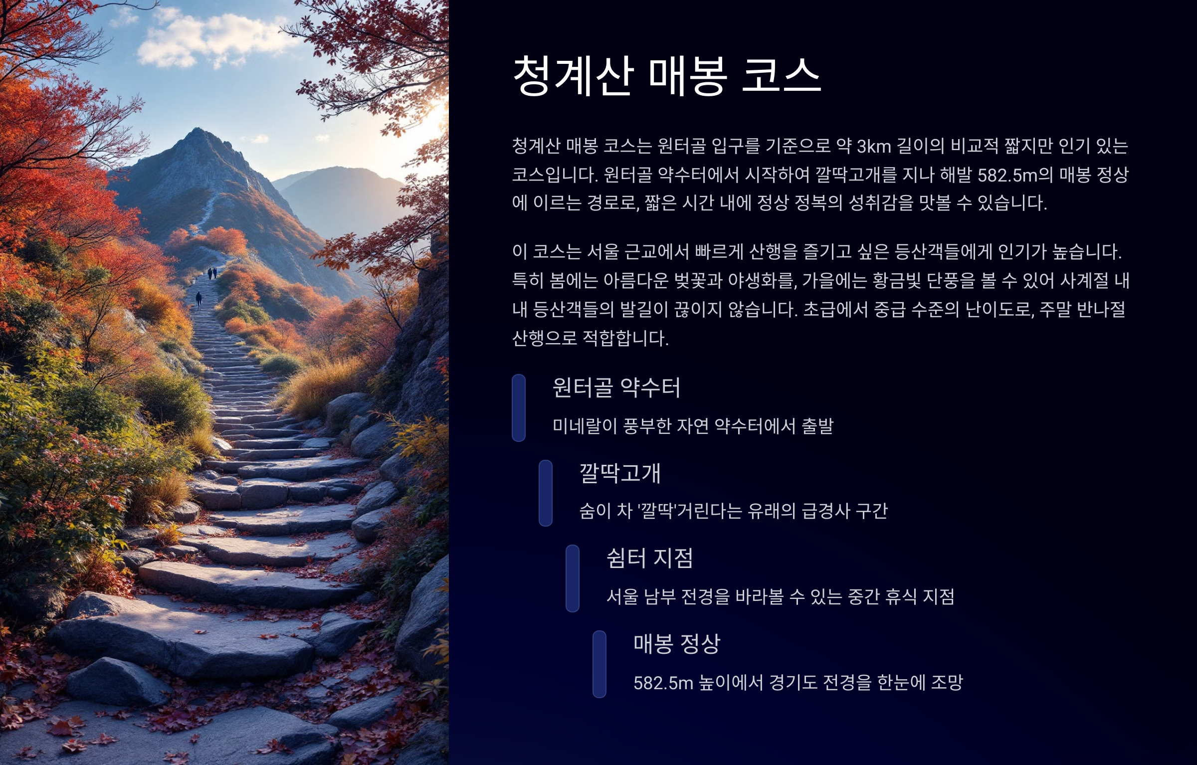| 청계산 매봉 | ★★☆☆☆ | 2시간 | 매우 우수 | 정상뷰, 계단길, 사계절 풍경 |