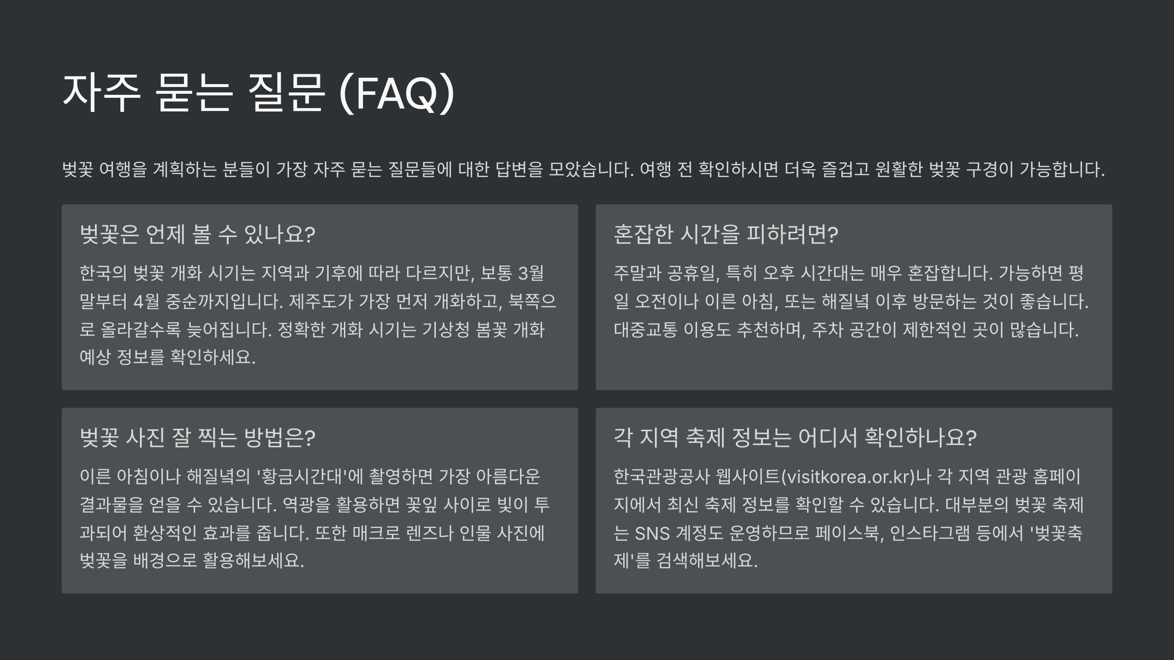 A1. 지역에 따라 다르지만, 서울은 3월 말~4월 초, 진해와 경주는 3월 말이 절정이에요. 매년 기상청 개화 예보를 참고하세요.