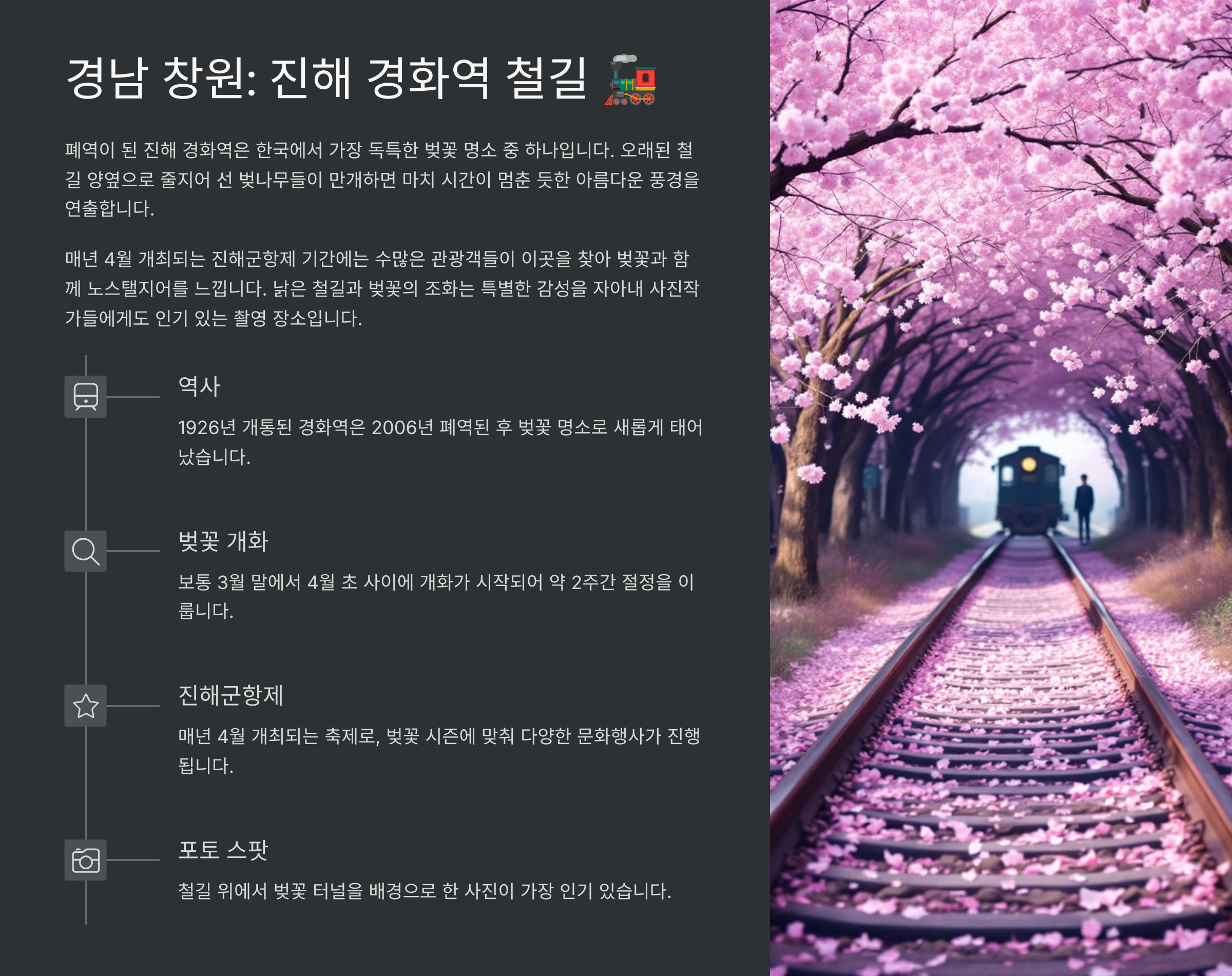 철길 옆을 따라 벚꽃이 활짝 핀 진해 경화역은 정말 환상적인 풍경을 자랑해요. 기차가 지나가는 철길과 벚꽃이 어우러진 그 모습은 아이들에겐 동화 속 세상처럼 느껴질 수밖에 없어요. 사진 찍기에도 최고의 장소라서 가족 단위로 가장 많이 찾는 곳 중 하나예요.