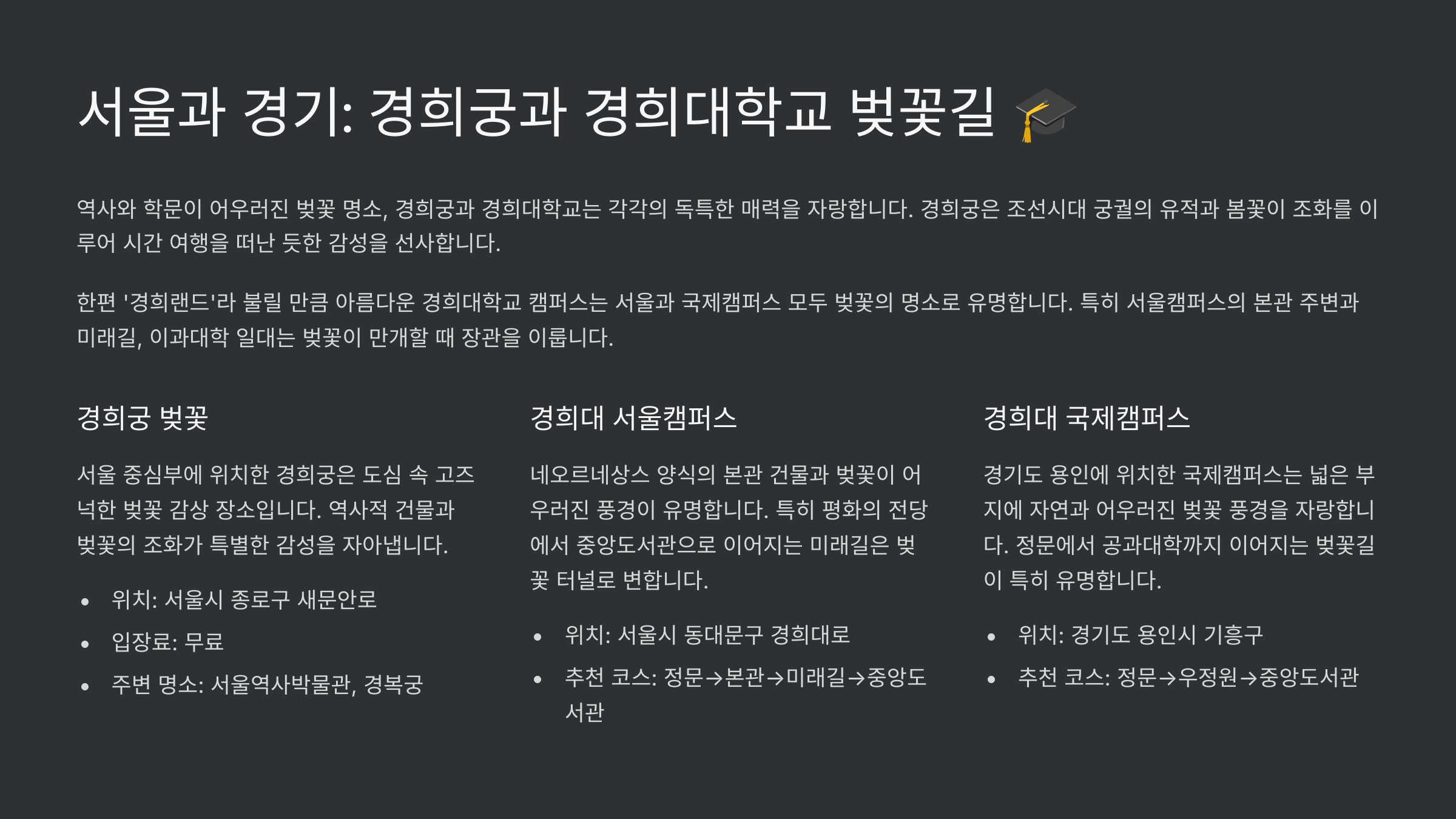 주말에는 캠퍼스가 개방되어 있어서 인근 주민들도 많이 찾지만, 평일엔 상대적으로 한산해서 조용히 벚꽃을 즐기기 좋아요. 경희대 후문 근처에는 카페거리도 있어 잠시 쉬어가기에도 좋답니다. 커피 한 잔, 아이는 핫초코 한 잔이면 봄소풍 완성이죠!