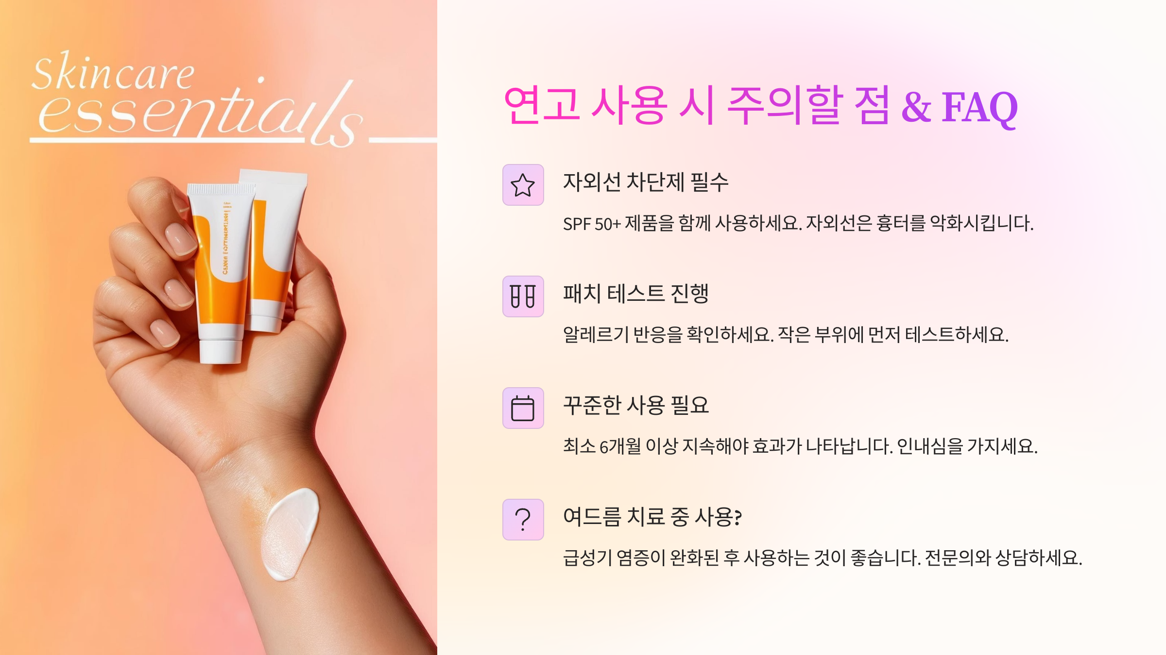 여드름 흉터 연고는 누구나 사용할 수 있지만, 잘못 사용하면 오히려 피부에 자극을 줄 수 있어요. 연고는 ‘치료제’이기 때문에 일반 화장품과는 다르게 사용법을 꼭 지켜야 해요. 사용 전에는 반드시 제품 설명서를 꼼꼼히 읽는 게 중요하답니다.