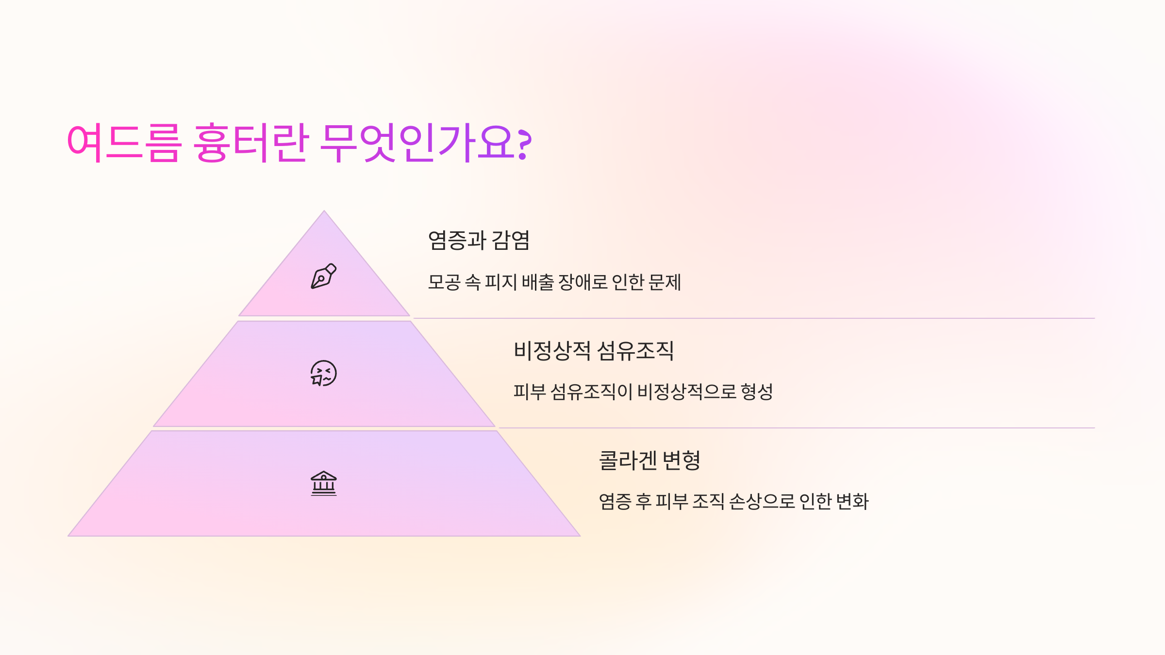 여드름 흉터는 염증성 여드름이 치유되는 과정에서 진피층까지 손상이 발생해 남는 흔적이에요. 보통 색소침착, 붉은 자국, 움푹 팬 자국(함몰 흉터) 등 다양한 형태로 나타나며, 피부 회복 능력과 여드름 관리 습관에 따라 정도가 달라지죠.