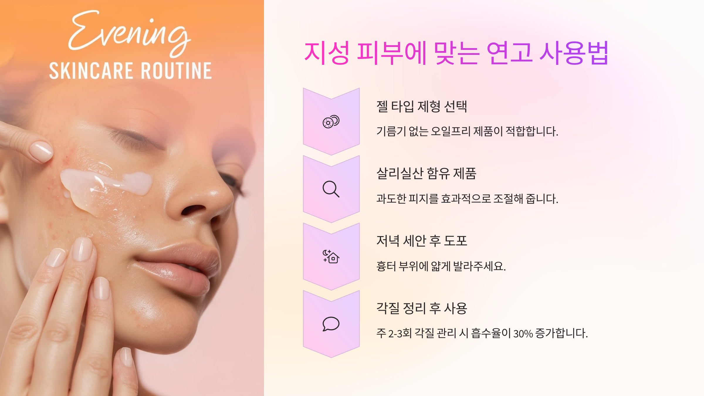 지성 피부는 피지 분비가 많아서 여드름이 잘 생기고, 흉터도 반복되기 쉬운 피부 타입이에요. 그래서 흉터 연고를 선택할 때는 유분감이 적고 산뜻한 제형을 고르는 것이 중요해요. 크림보다는 젤이나 겔 타입이 적합하답니다.