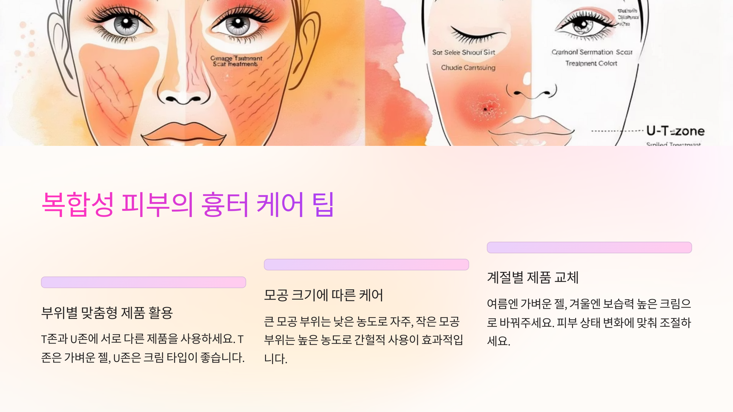 복합성 피부는 부위별로 성향이 다른 복잡한 타입이에요. T존은 지성인데 U존은 건성인 경우가 많죠. 그래서 연고도 부위별로 나눠서 바르는 것이 효과적이에요. 예를 들어, T존엔 겔 타입, 볼 부위엔 크림 타입을 사용하는 식이에요.