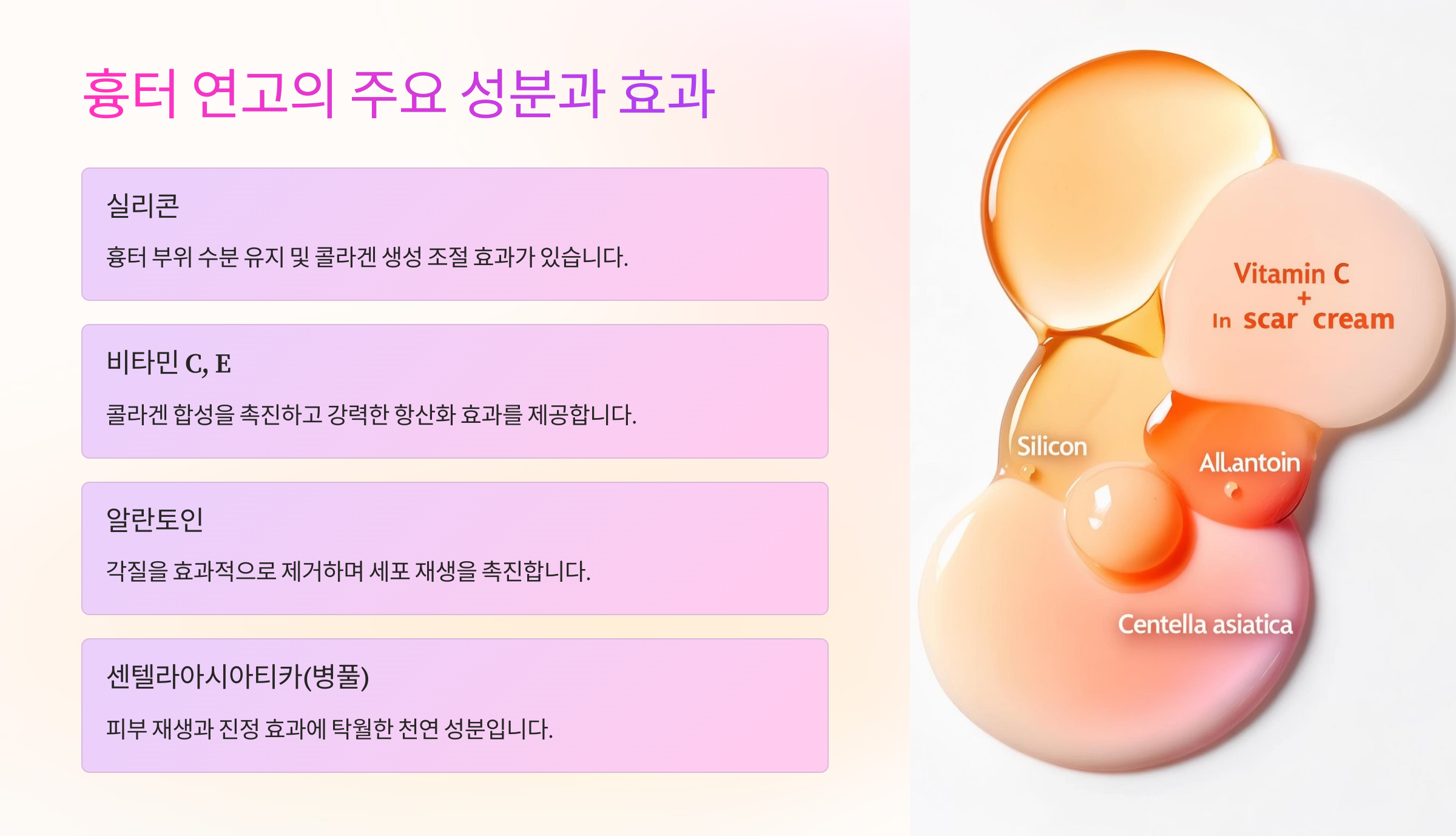 흉터 연고에는 피부 재생과 염증 완화에 도움을 주는 다양한 성분들이 포함되어 있어요. 대표적인 성분으로는 알란토인, 판테놀, 히알루론산, 실리콘 겔 등이 있어요. 각 성분은 특정 흉터 유형에 맞춰 작용한답니다.