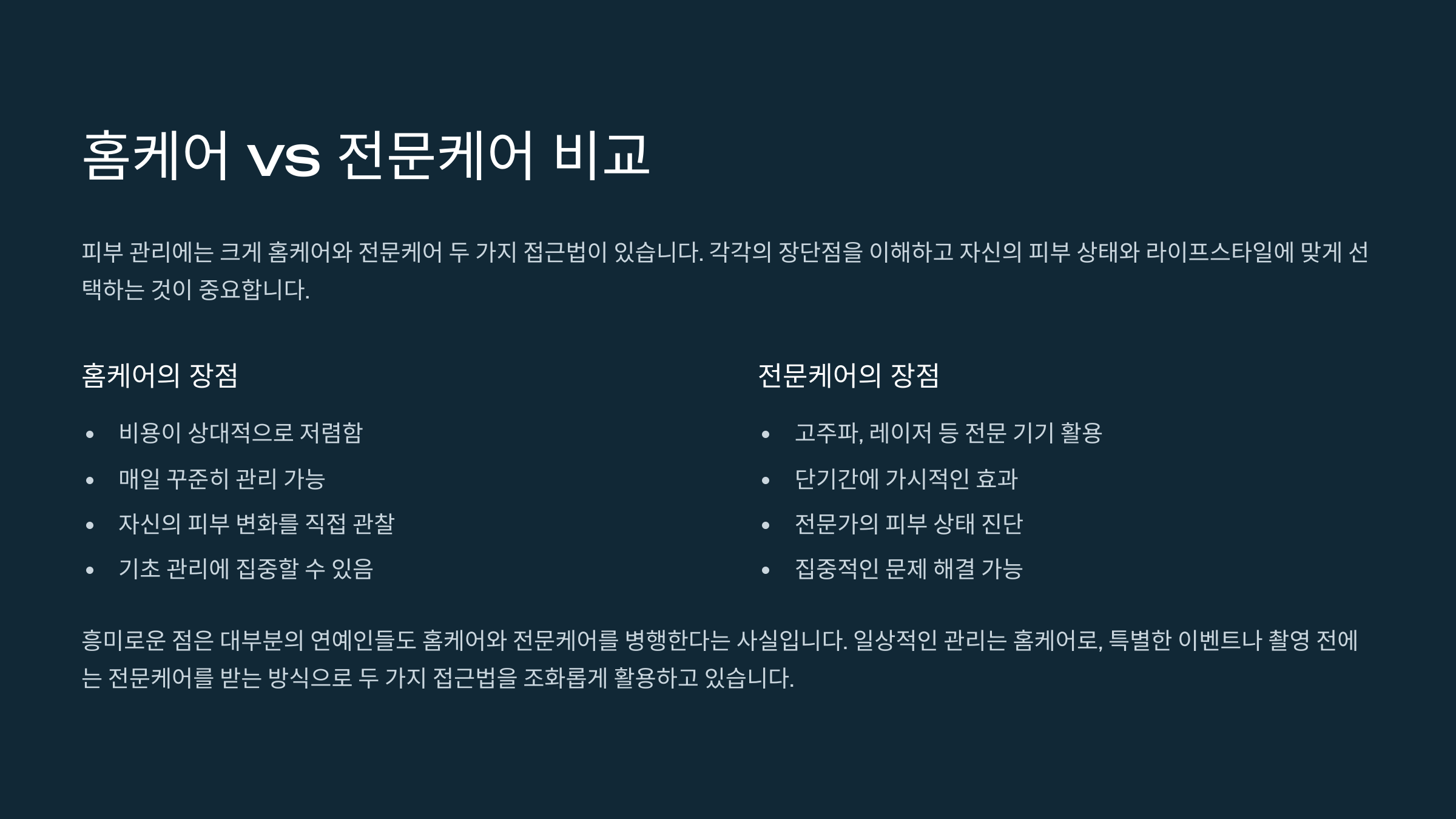홈케어와 전문케어 사이에서 고민하는 분들이 정말 많을 거예요. 제가 6개월 동안 양쪽 모두 체험해본 결과, 각각의 장단점이 확실히 다르더라고요. 홈케어의 가장 큰 장점은 편리함과 경제성이에요. 집에서 편안하게 자신만의 시간에 맞춰서 관리할 수 있고, 장기적으로 비용도 훨씬 절약할 수 있어요. 특히 바쁜 직장인들에게는 홈케어가 현실적인 선택이 될 수 있답니다. 하지만 전문케어에 비해서는 즉각적이고 극적인 효과를 기대하기는 어려워요.