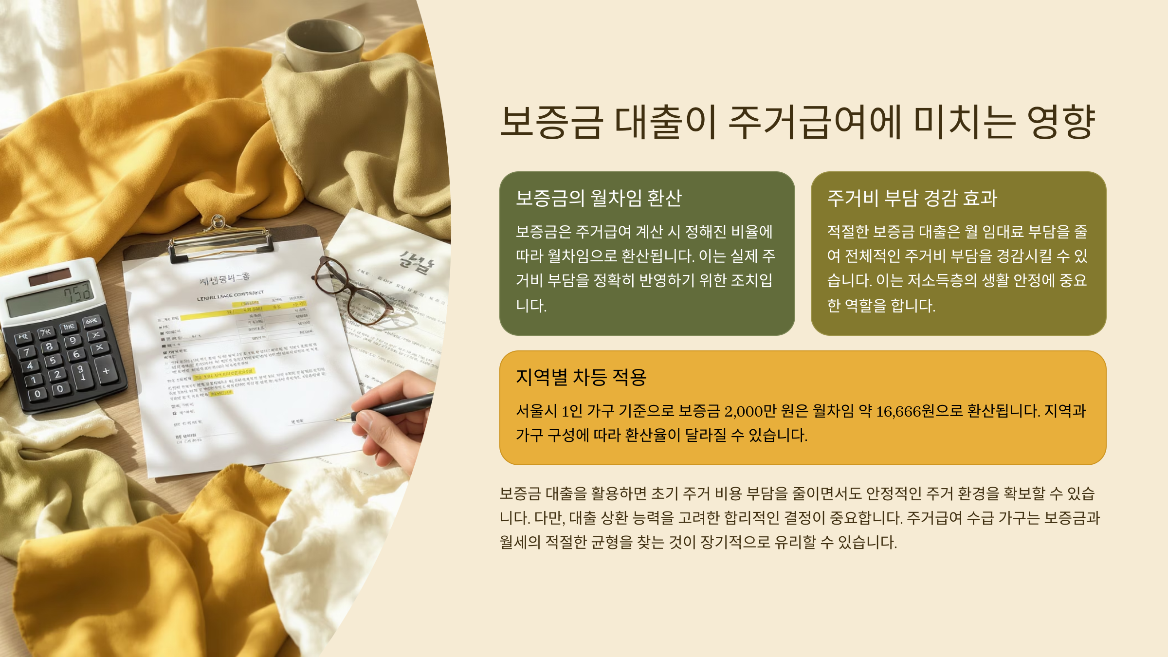 월세 보증금 대출이 주거급여에 미치는 영향을 정확히 알아보면, 직접적인 제외 사유는 아니에요. 하지만 몇 가지 간접적인 영향은 있을 수 있어요. 첫 번째로 대출 이자를 소득으로 보지 않기 때문에 소득 인정액 계산에는 직접 영향을 주지 않아요. 다만 대출 원금 상환액이나 이자 부담으로 인한 가계 지출 증가는 실질적인 경제적 부담이 될 수 있죠.