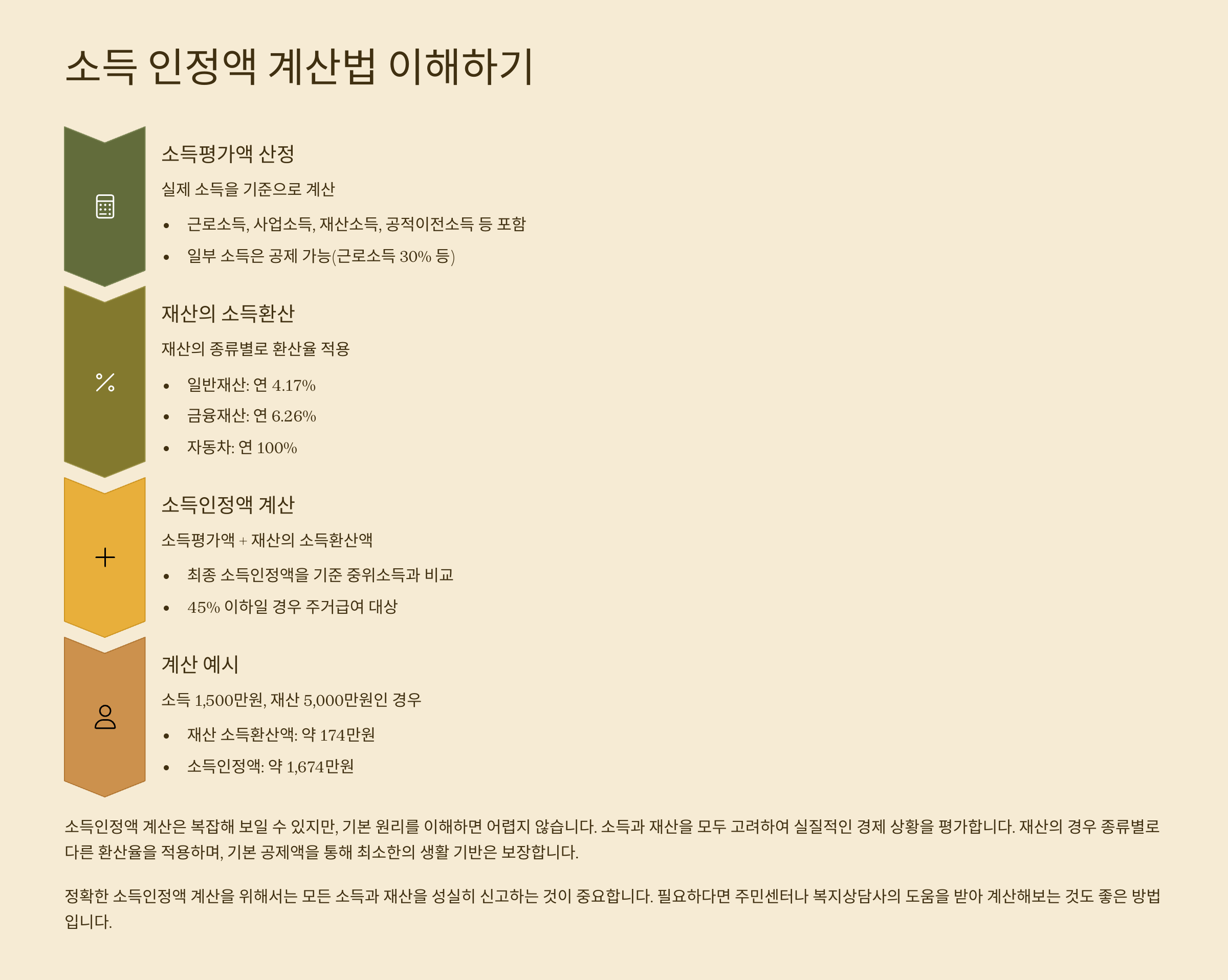 소득 인정액 계산은 주거급여 자격 판정의 핵심이에요. 소득 인정액은 실제소득에 재산의 소득환산액을 더한 금액인데, 생각보다 복잡해요. 실제소득에는 근로소득, 사업소득, 재산소득, 공적이전소득, 사적이전소득이 모두 포함돼요. 여기서 중요한 건 모든 소득을 다 합치는 게 아니라 각각의 공제액이 있다는 거예요. 근로소득의 경우 30만원 공제가 있고, 기초공제도 적용돼요.