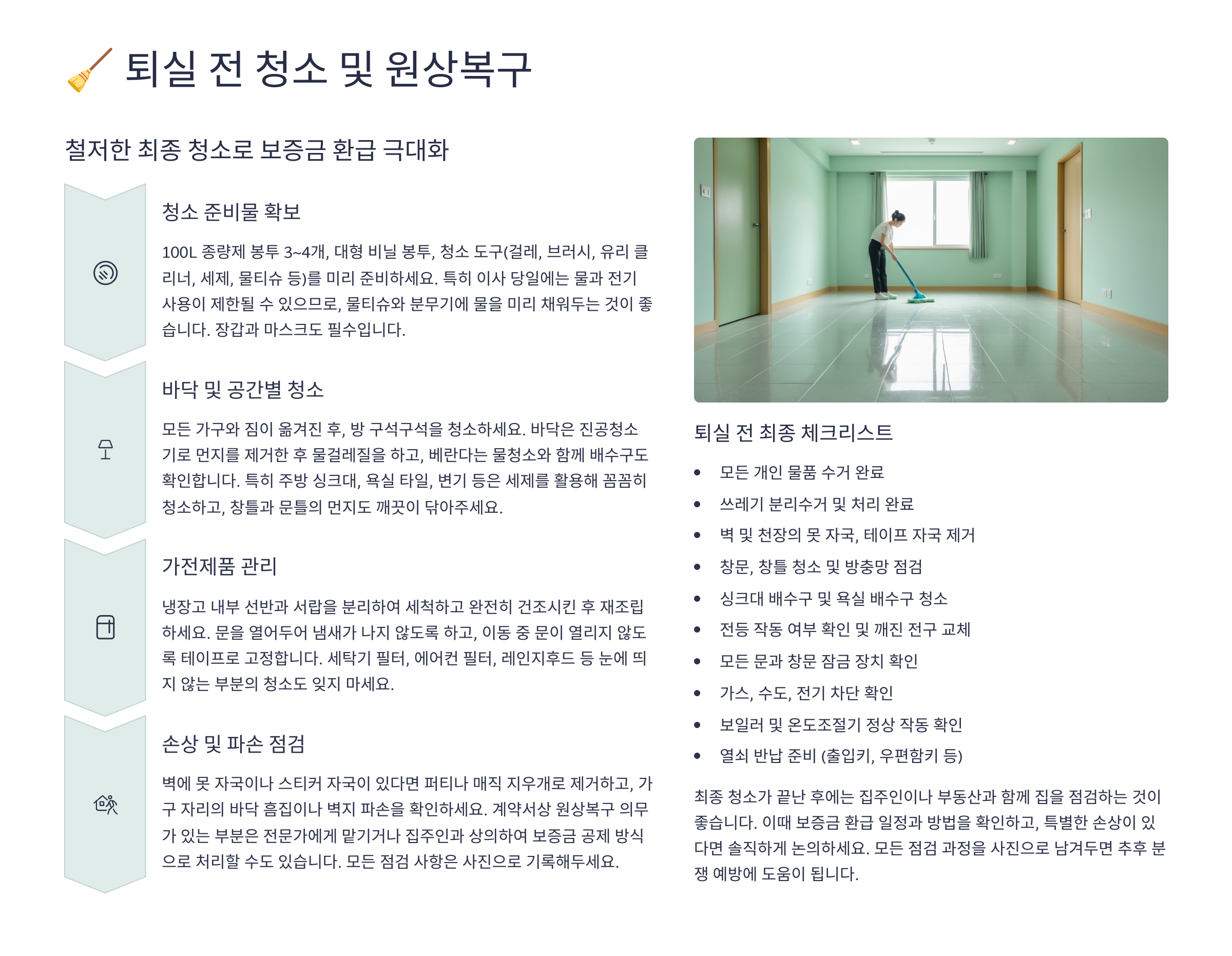 이사 짐을 다 옮기고 나면 마지막으로 해야 할 일이 청소예요. 깨끗하게 청소해서 넘겨주는 게 기본 매너이자, 보증금을 온전히 돌려받는 방법이기도 해요. 집주인이나 부동산에서 퇴실 점검을 하러 올 텐데, 그전에 깔끔하게 정리해두면 좋은 인상을 남길 수 있어요.