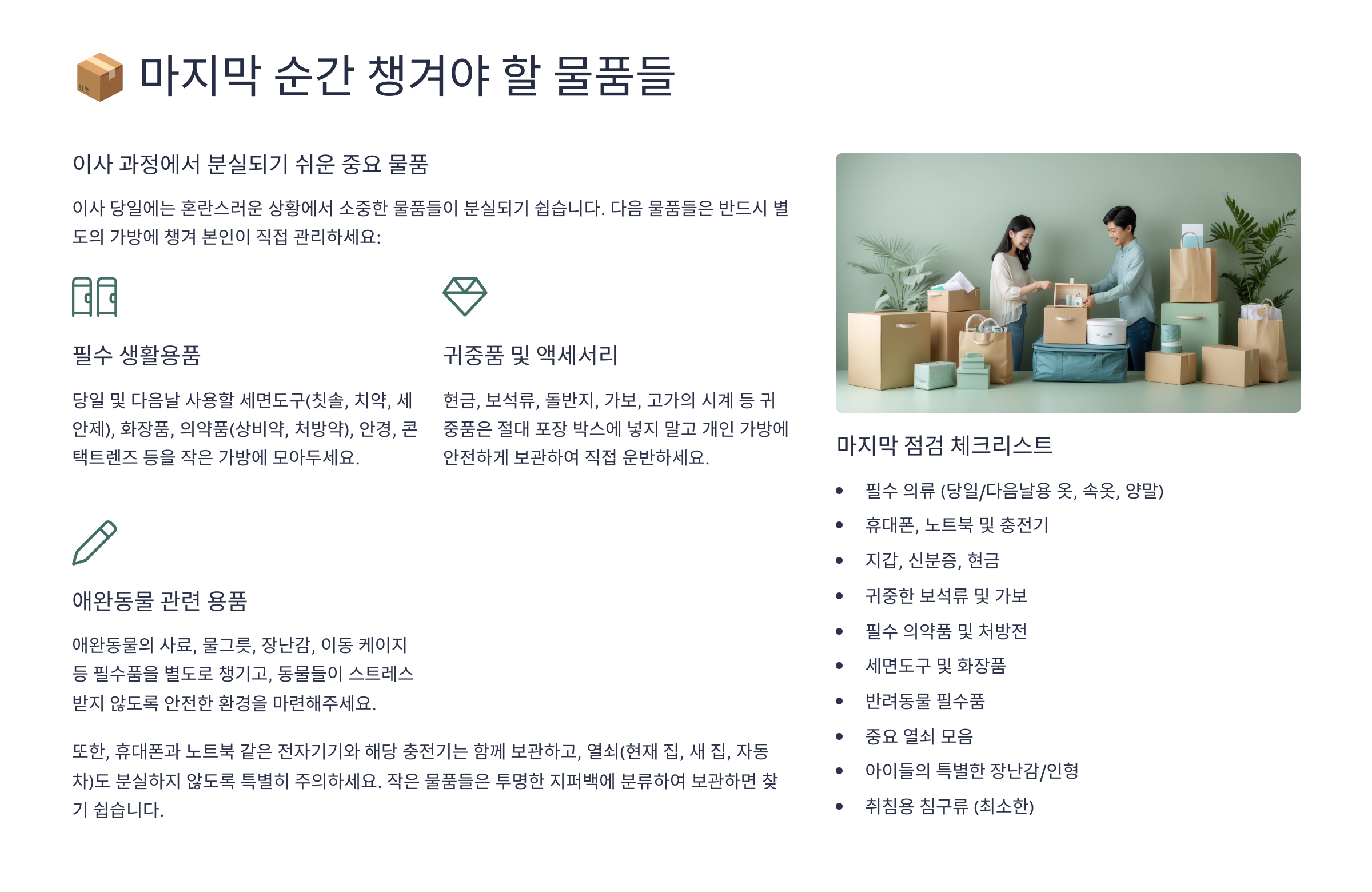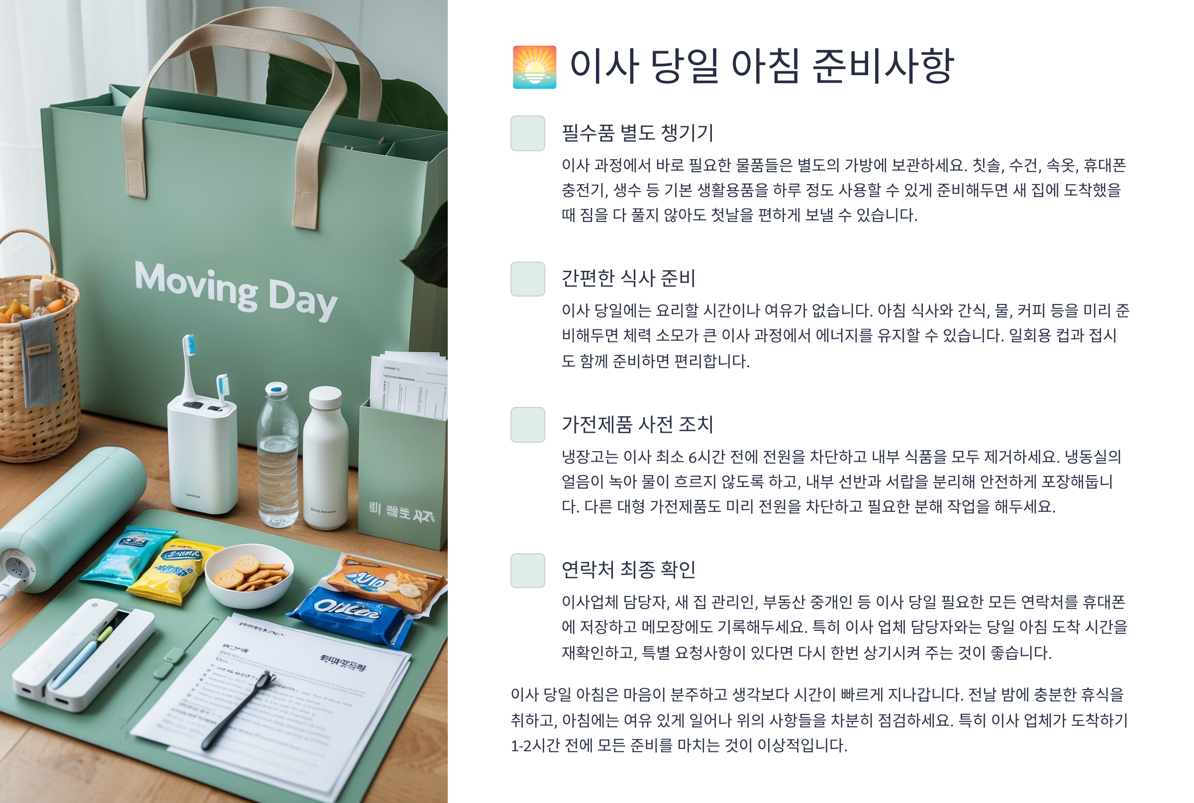 많은 분들이 이사 준비는 철저히 하면서도 정작 당일 아침에는 허둥지둥하다가 중요한 걸 놓치는 경우가 많아요. 제가 생각했을 때 이사 당일 아침의 체크리스트는 이사 성공의 절반을 차지한다고 봐요. 지금부터 차근차근 알려드릴 테니 꼭 메모해두시고 활용하세요!