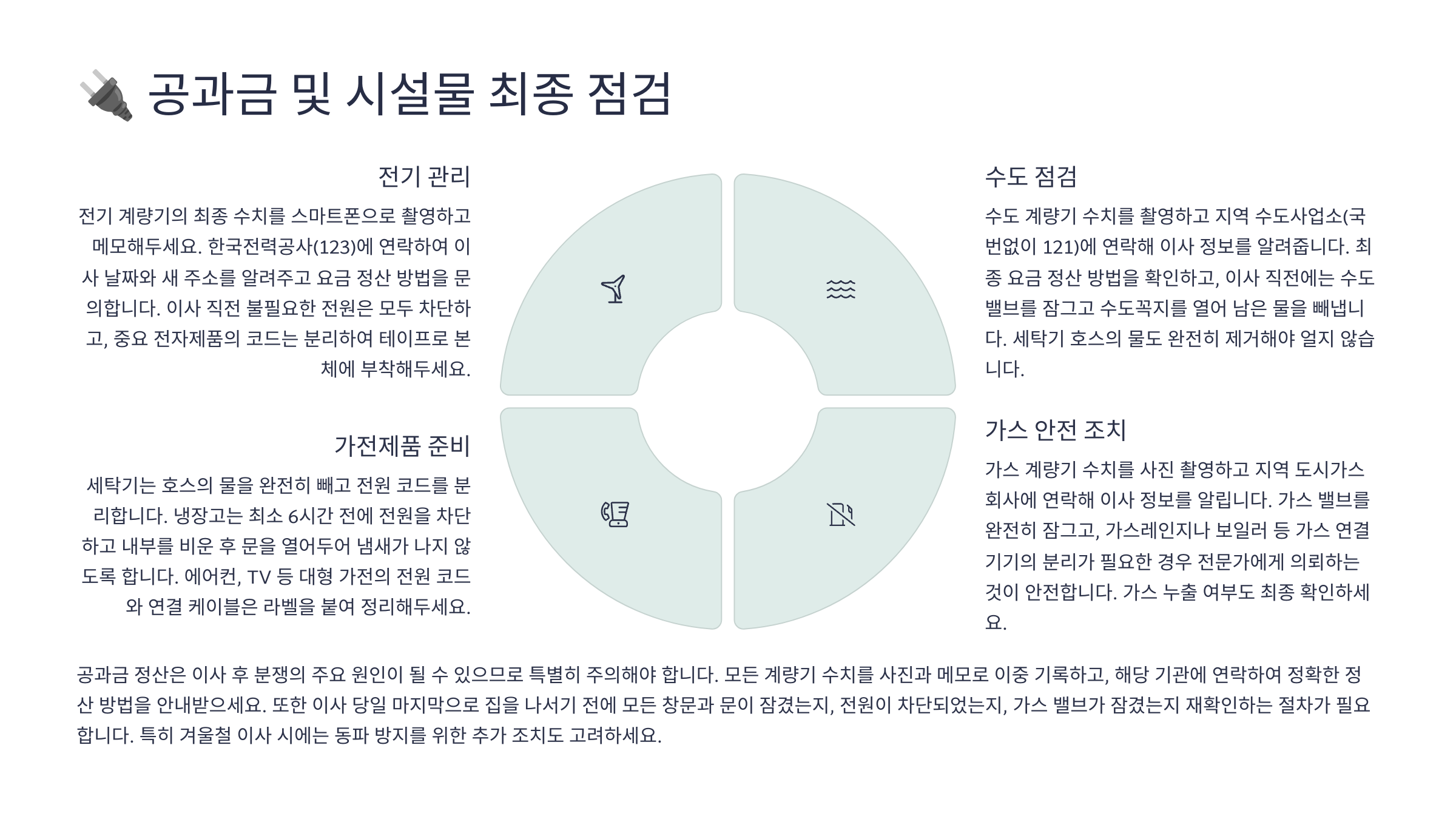 가스 밸브는 완전히 잠그고, 가스레인지의 건전지도 빼두세요. 도시가스 요금 정산을 위해 가스공사에 연락하는 것도 잊지 마세요. 보통 이사 전날이나 당일 아침에 검침원이 방문하는데, 시간 약속을 잘 맞춰야 해요. 📱