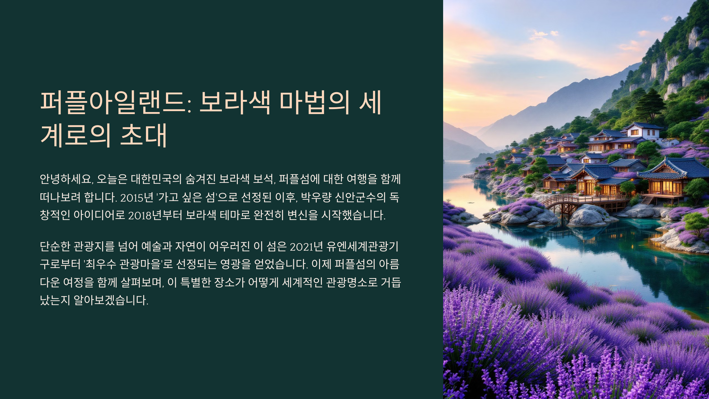 퍼플섬이라는 이름이 알려지기 시작한 건 2021년쯤부터예요. '세계에서 가장 아름다운 보라색 마을'이라는 컨셉이 SNS를 통해 입소문을 타면서 많은 사람들이 찾기 시작했죠. 지금은 한국 관광 100선에도 선정될 정도로 인기 있는 여행지랍니다! 🏆