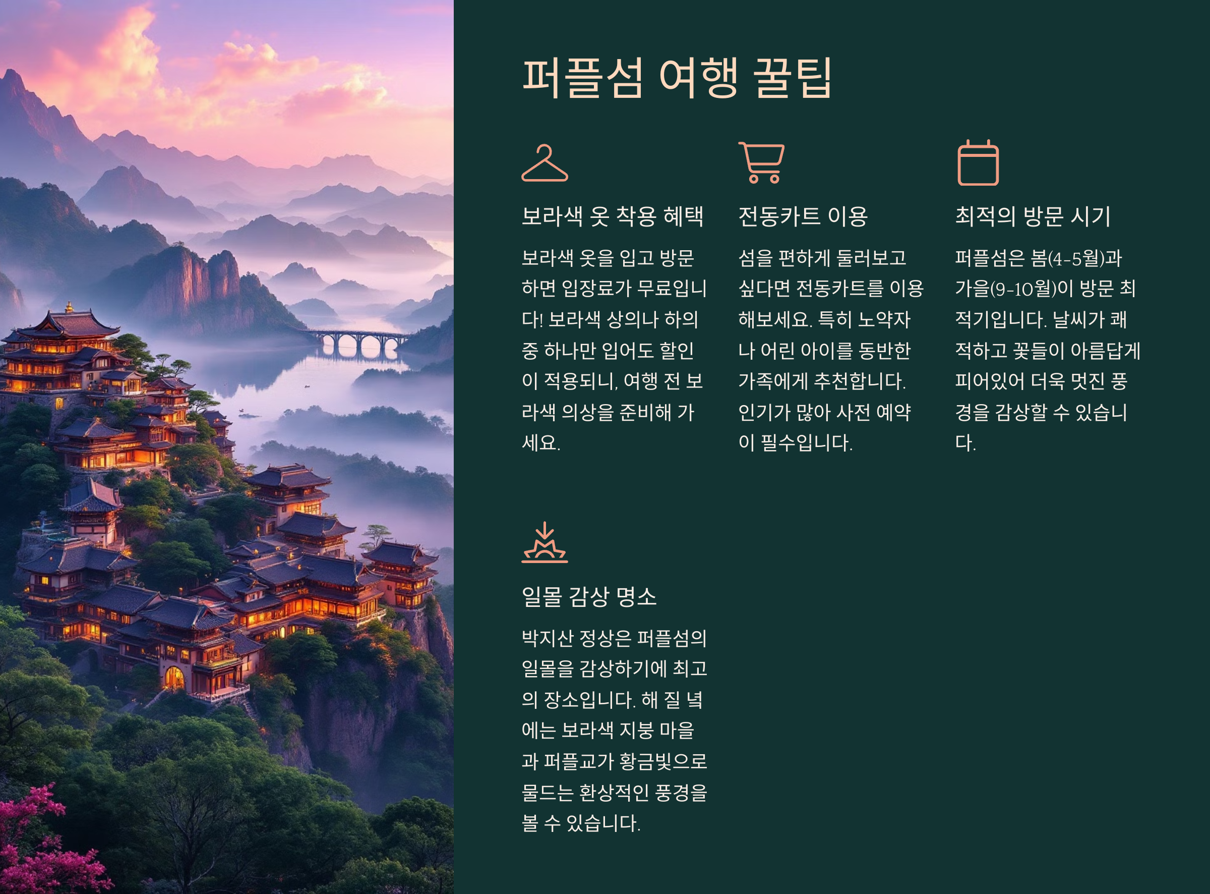 퍼플섬을 제대로 즐기려면 몇 가지 꿀팁을 알고 가면 좋아요! 교통편부터 최적의 방문 시기, 놓치면 아쉬운 포인트까지 퍼플섬을 100% 즐기는 방법을 소개할게요. 💜✨