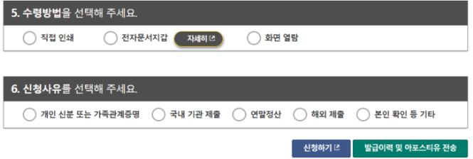7. 인증서 수령 방법과 신청 사유를 선택한 후 "신청" 단추를 누릅니다.