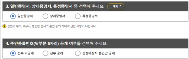 6. 발급할 증명서의 성격과 주민등록번호 공개 여부를 선택합니다.