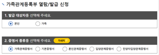 5. 가족관계증명서를 받을 사람과 원하는 증명서의 종류를 선택합니다.