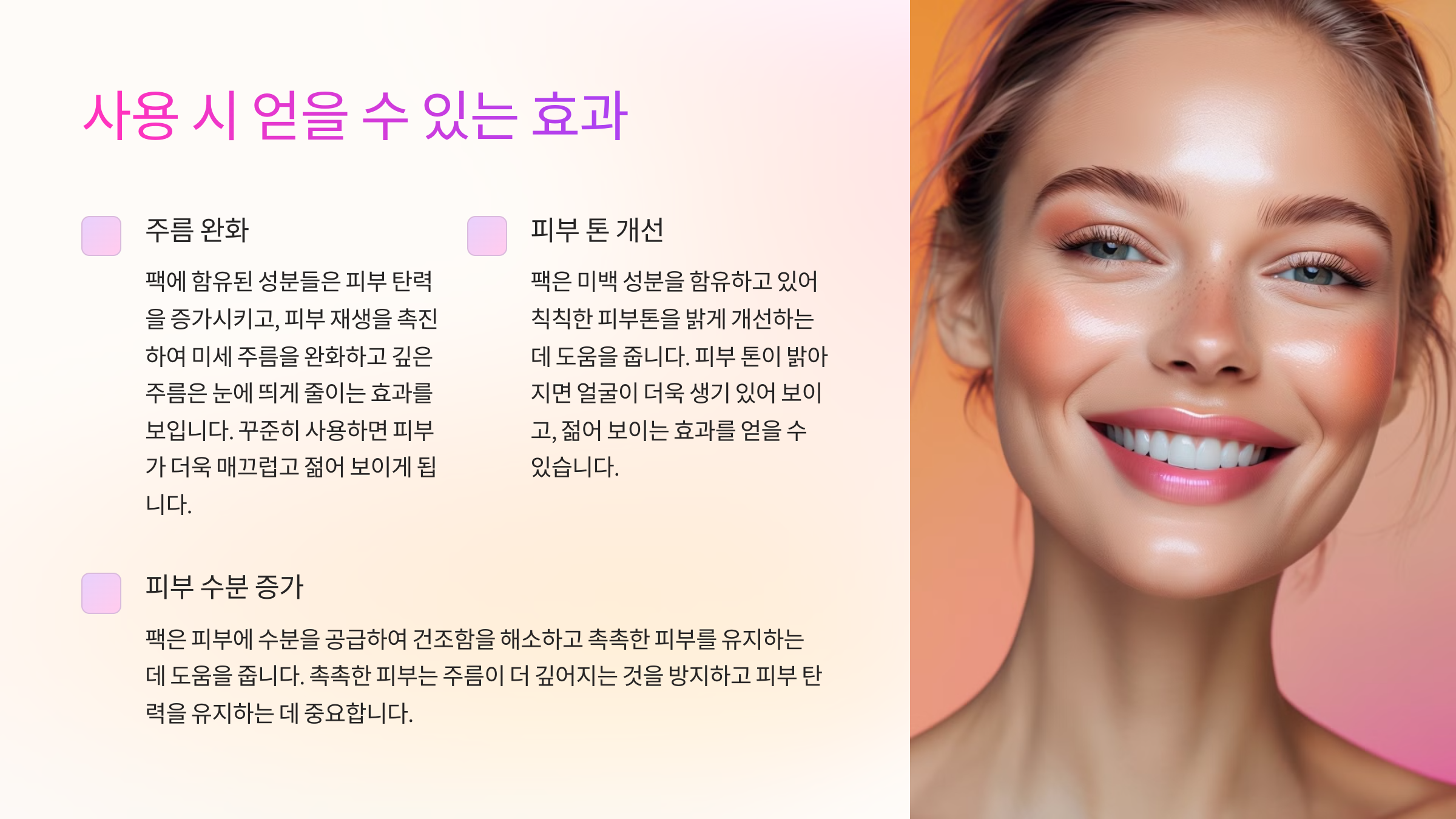 주름 개선 팩은 단순히 주름을 줄이는 것에 그치지 않고, 다양한 피부 개선 효과를 제공해요. 이를 통해 전반적인 피부 건강과 아름다움을 증진시킬 수 있답니다.
