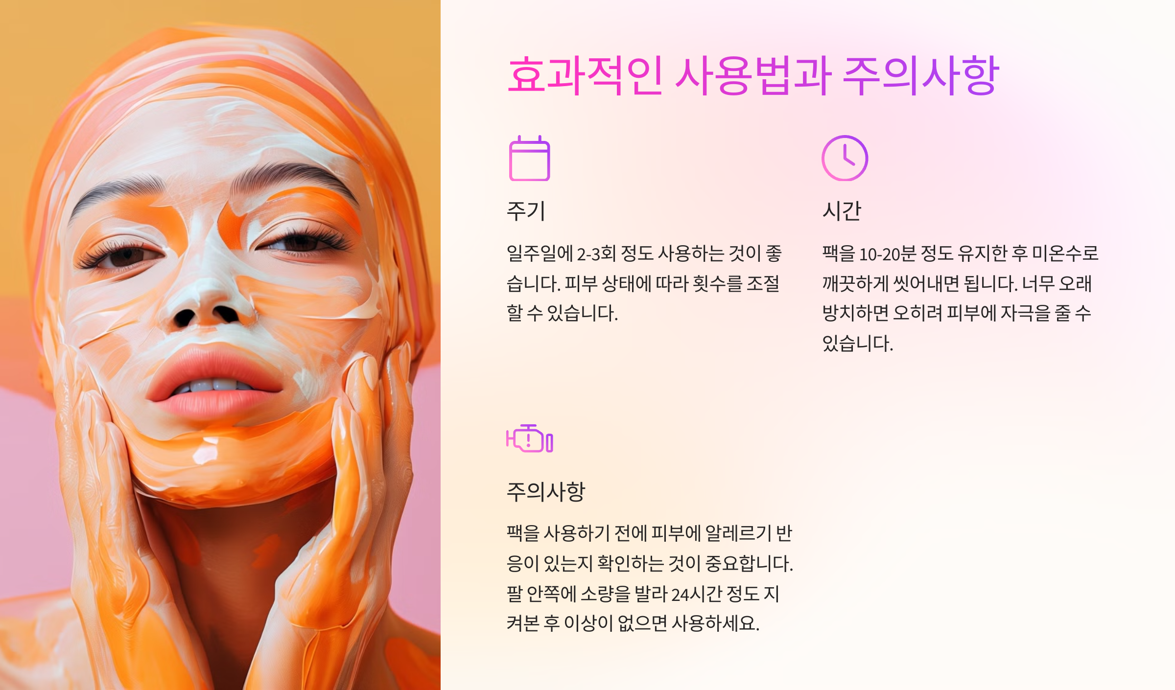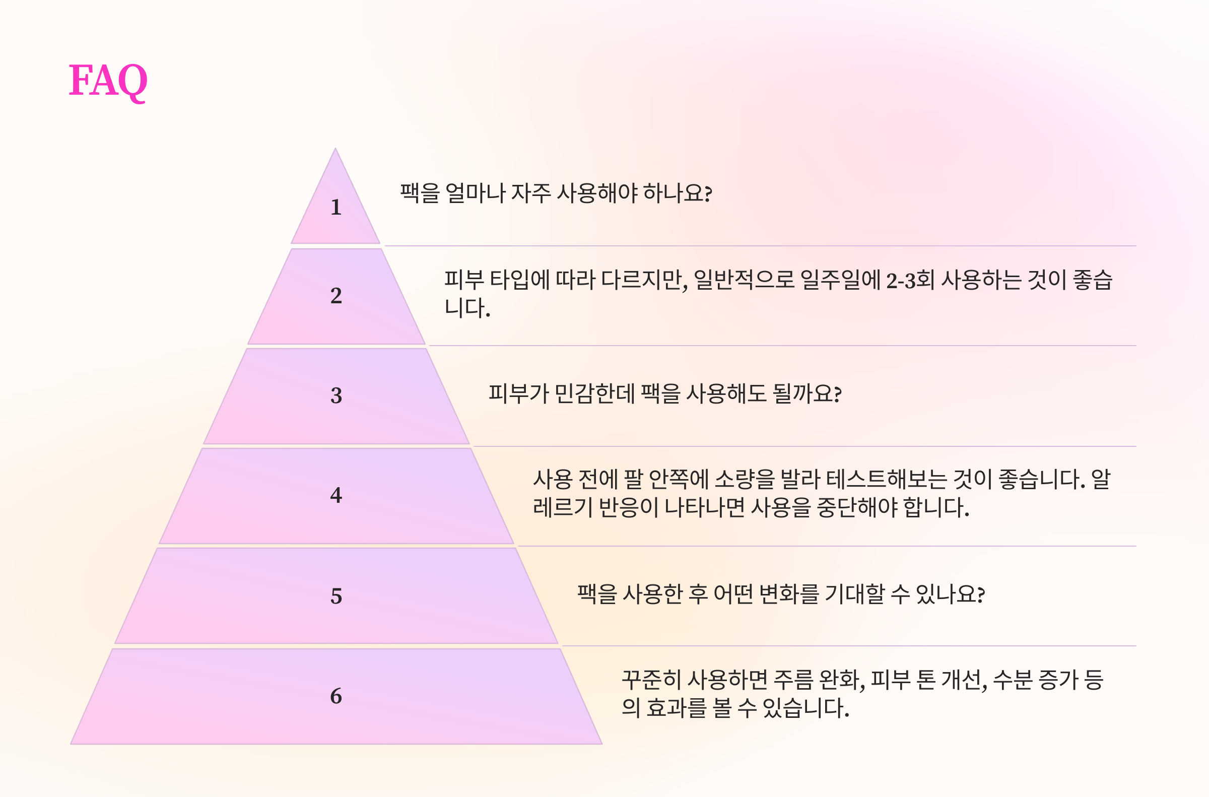 2. 사용 시간 준수: 팩의 권장 사용 시간을 반드시 지켜야 해요. 너무 오래 두면 피부가 건조해지거나 자극을 받을 수 있어요.