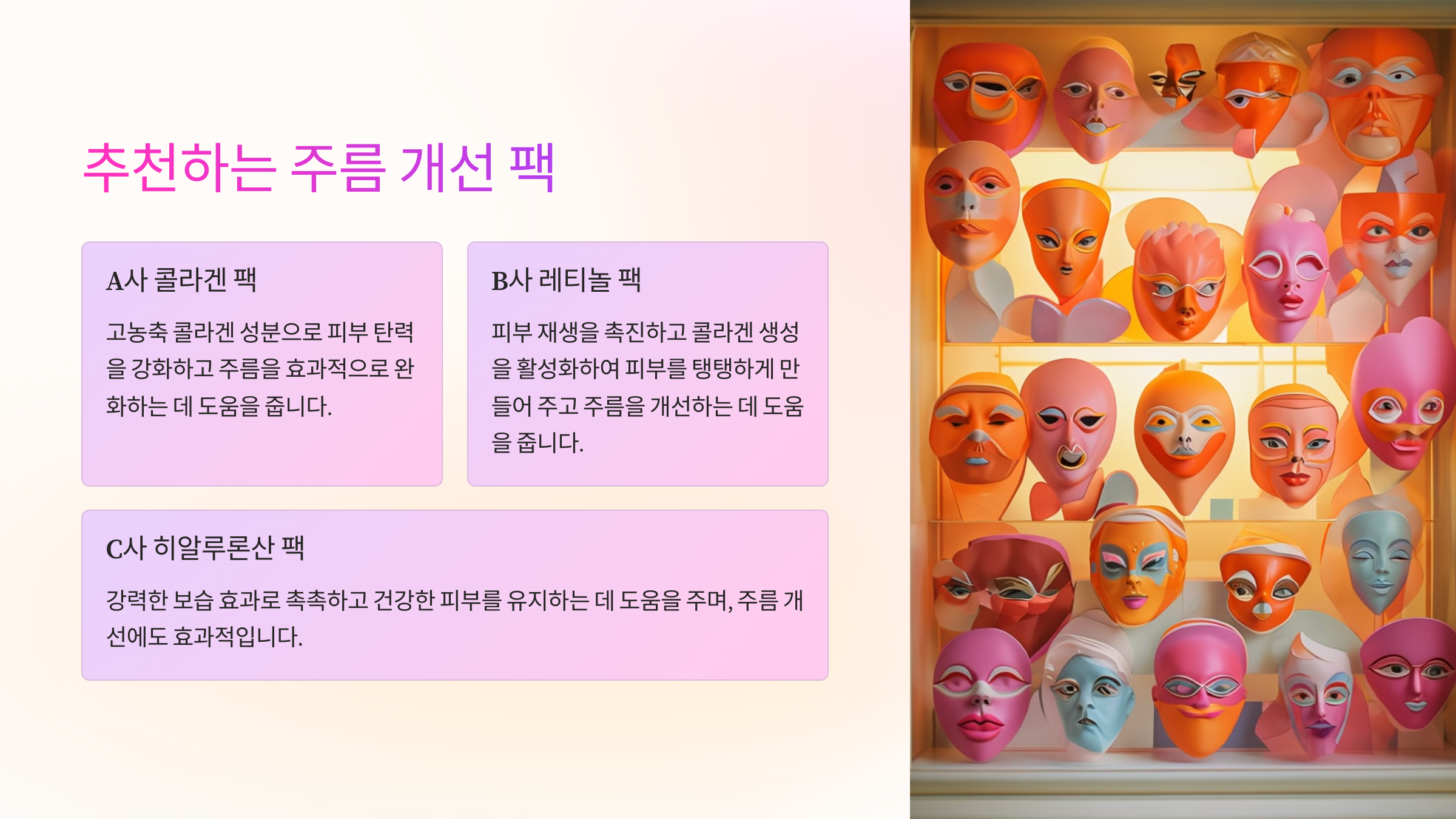 현재 시장에는 많은 주름 개선 팩이 있어요. 그중에서도 효과가 뛰어난 몇 가지 제품을 소개할게요.