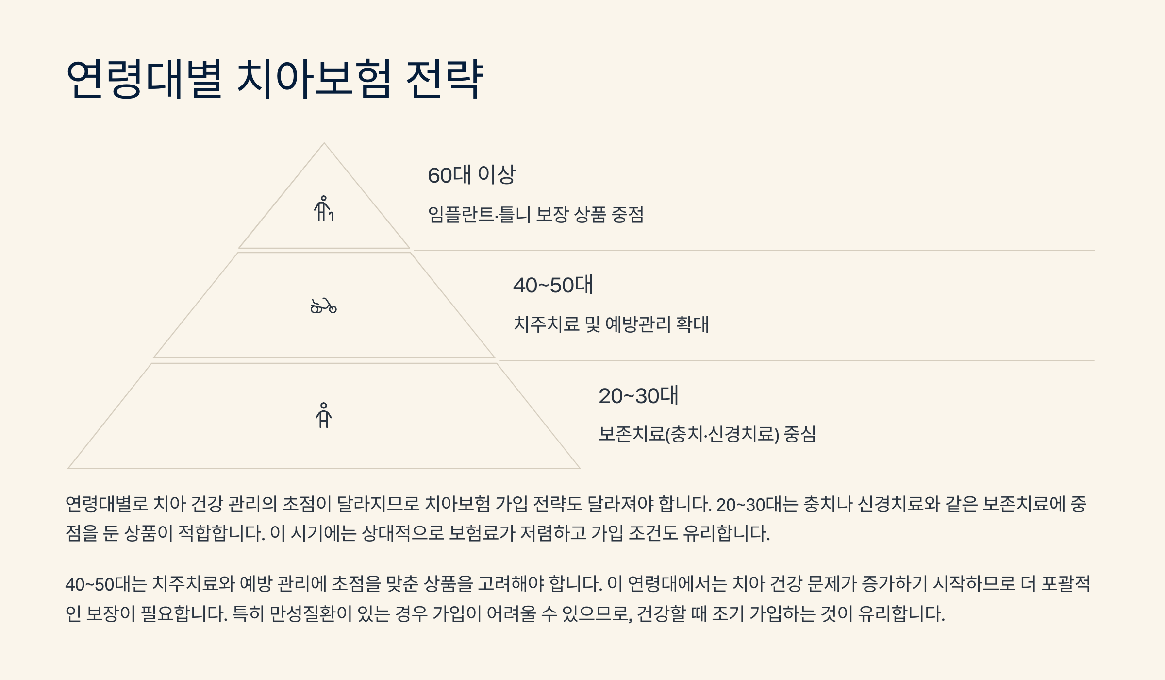 치아 보험은 나이에 따라 필요성과 전략이 크게 달라져요. 20대와 60대가 겪는 치아 문제는 완전히 다르고, 필요한 치료도 다르기 때문에 연령대별로 맞춤형 접근이 필요해요. 또한 나이가 들수록 보험료도 비싸지고 가입 조건도 까다로워지므로, 적절한 시기에 가입하는 것이 중요해요.