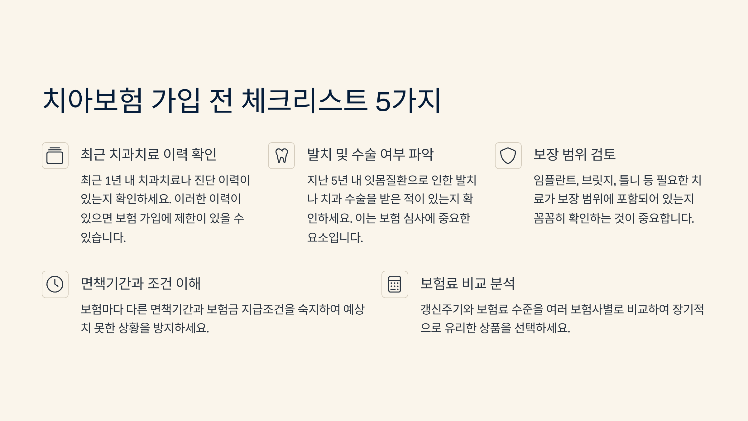 치아 보험 가입을 결정했다면, 이제 어떤 상품을 선택할지가 중요해요. 시중에 나와 있는 치아 보험 상품들은 겉보기에는 비슷해 보이지만, 실제로는 보장 내용과 조건이 천차만별이거든요. 잘못 선택하면 보험료만 내고 정작 필요할 때 제대로 보장받지 못하는 상황이 발생할 수 있어요. 다음 5가지 체크리스트를 꼼꼼히 확인해보세요.