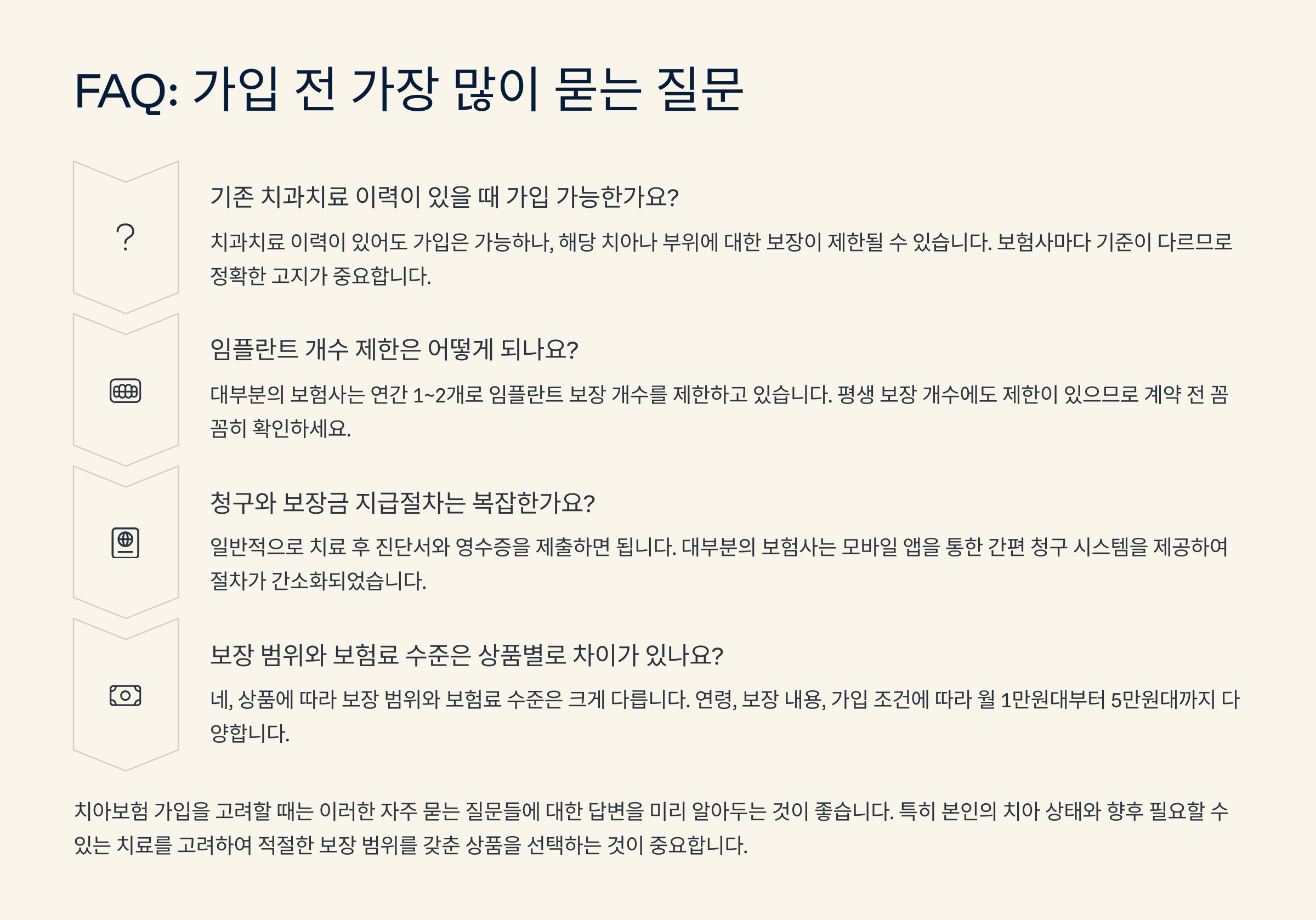 50대 이상에서는 현실적인 접근이 필요해요. 이미 치아 상태가 많이 악화된 경우가 많고, 보험료도 상당히 비싸져요. 또한 기존 치아 문제에 대한 면책 조건 때문에 실질적으로 보장받을 수 있는 범위가 제한될 수 있어요. 따라서 보험 가입보다는 필요한 치료를 먼저 받고, 향후 유지 관리를 위한 목적으로 보험을 고려하는 것이 현실적이에요.