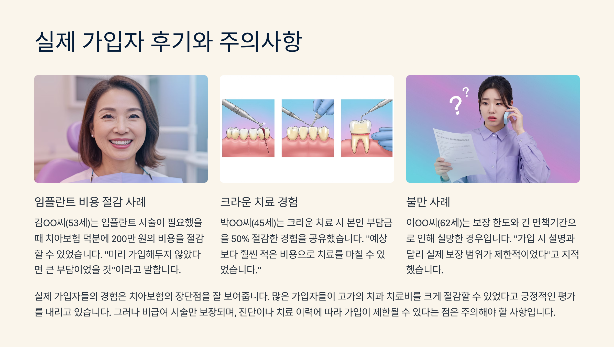 정신적 안정감도 많이 언급되는 장점이에요. 50대 자영업자 이모씨는 "치과에 가는 것이 두렵지 않게 되었다. 비용 걱정 없이 아플 때 바로 갈 수 있어서 마음이 편하다"고 후기를 남겼어요. 치과 공포증이 있는 분들에게는 이런 심리적 효과도 큰 의미가 있어요.